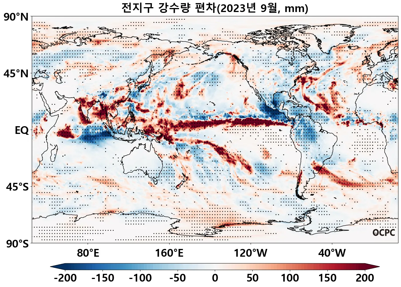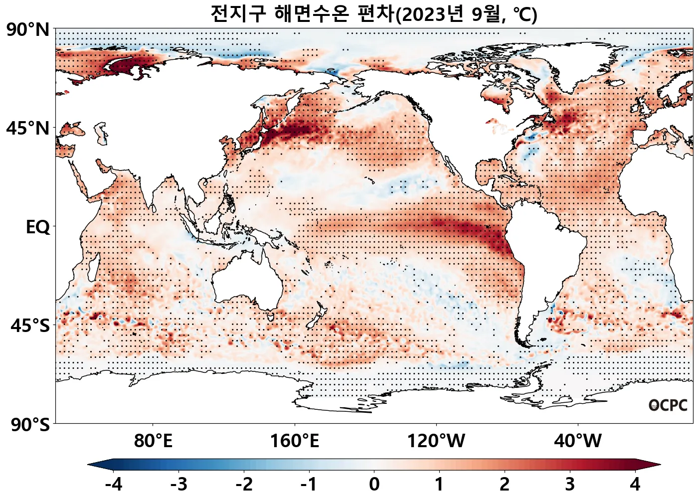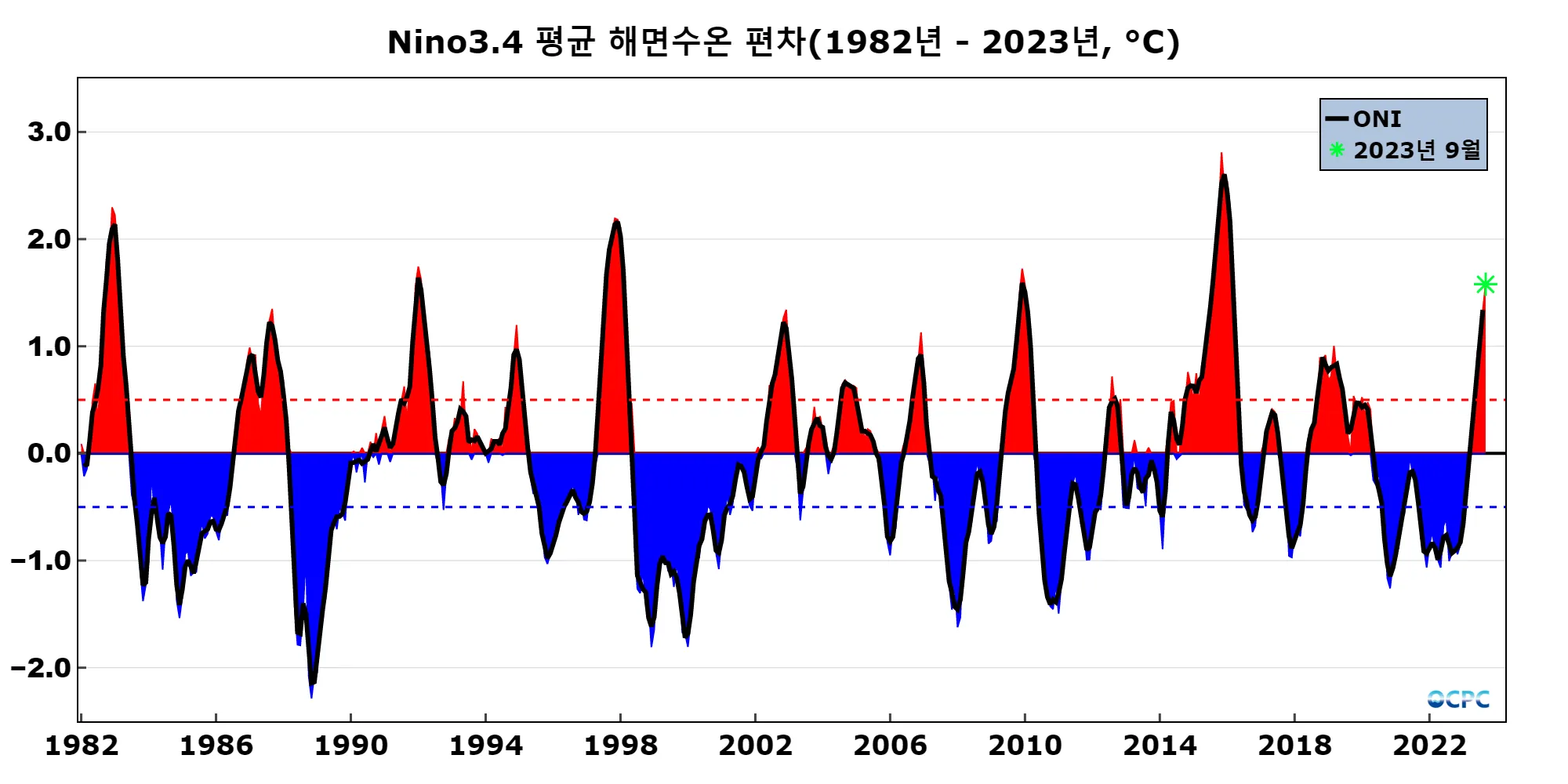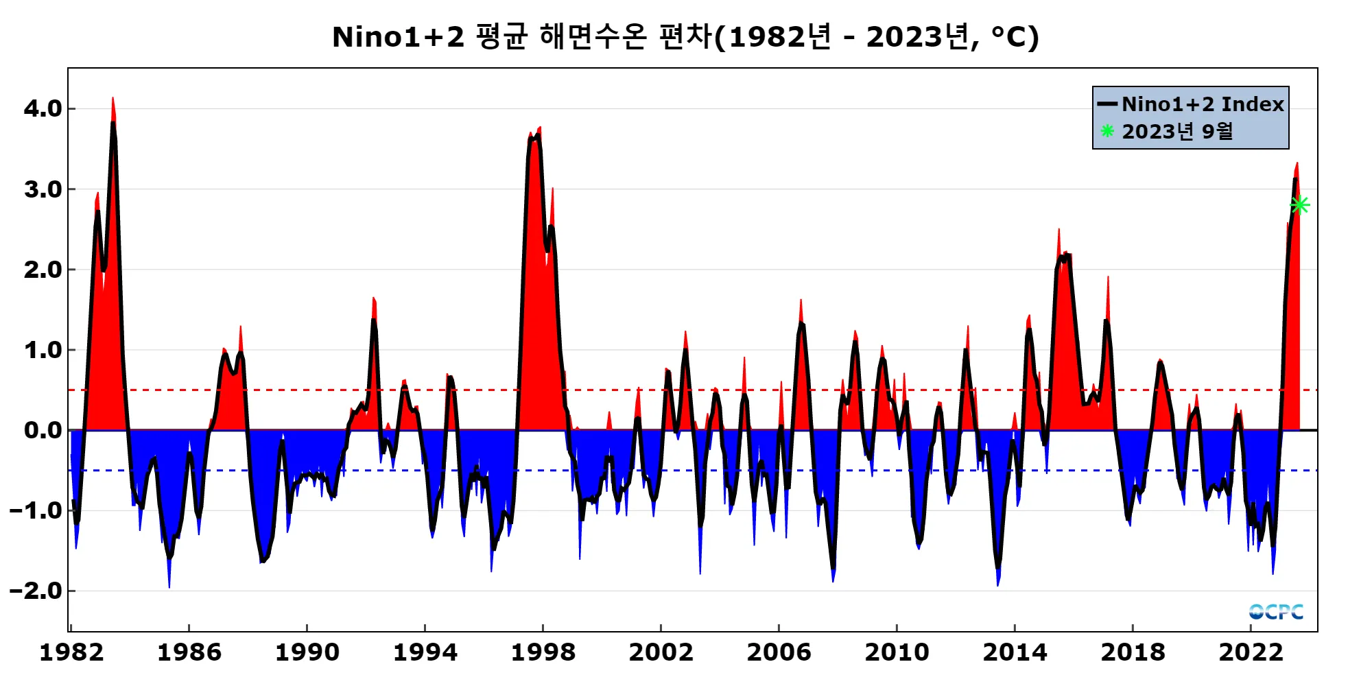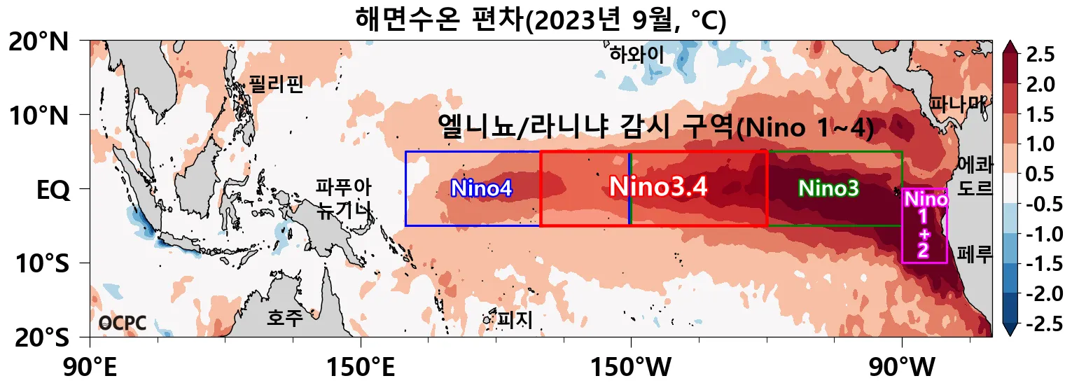엘니뇨/라니냐 감시구역인 열대태평양 Nino3.4 해역(5°S~5°N, 170°W~120°W)의 9월 평균 해면수온 편차는 1.6°C, Nino1+2해역(10°S~0°, 90°W~80°W)은 2.8°C로 엘니뇨가 강하게 발달하고 있습니다.