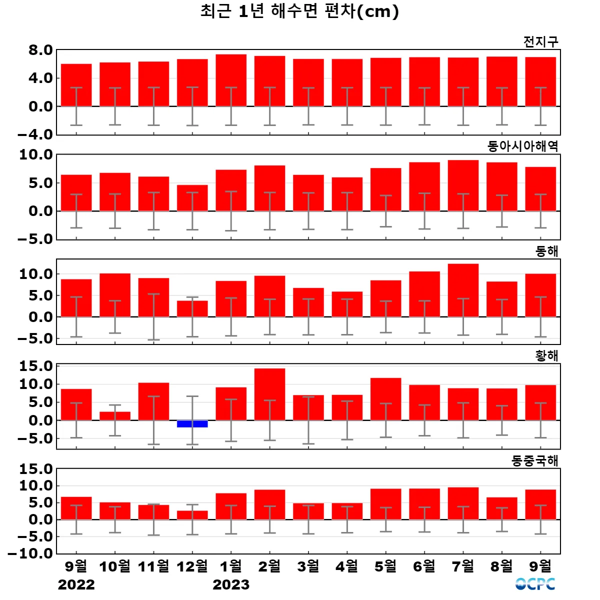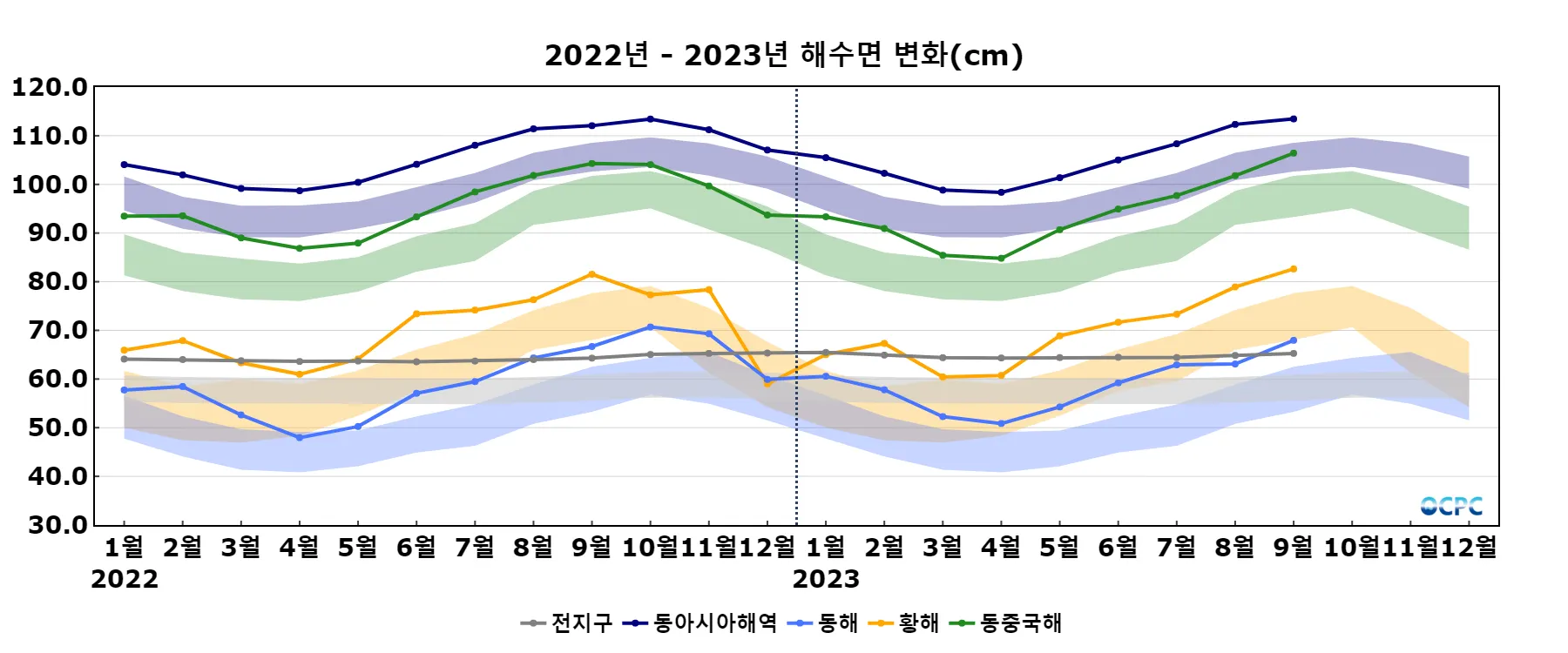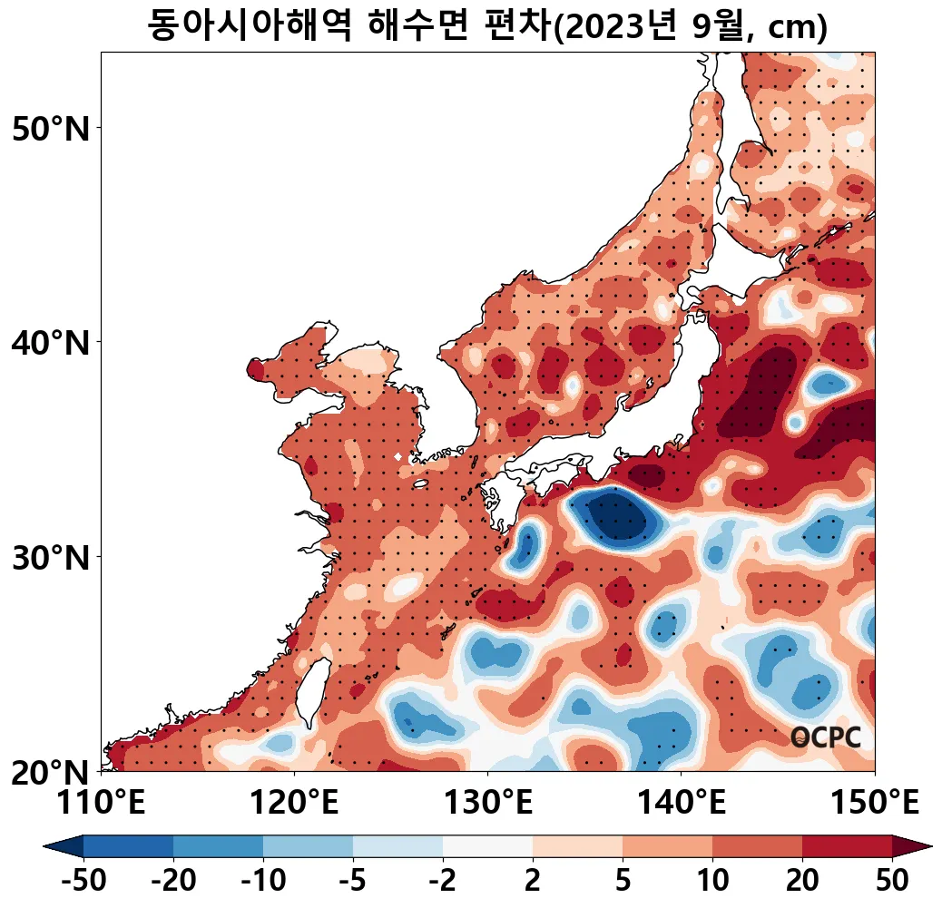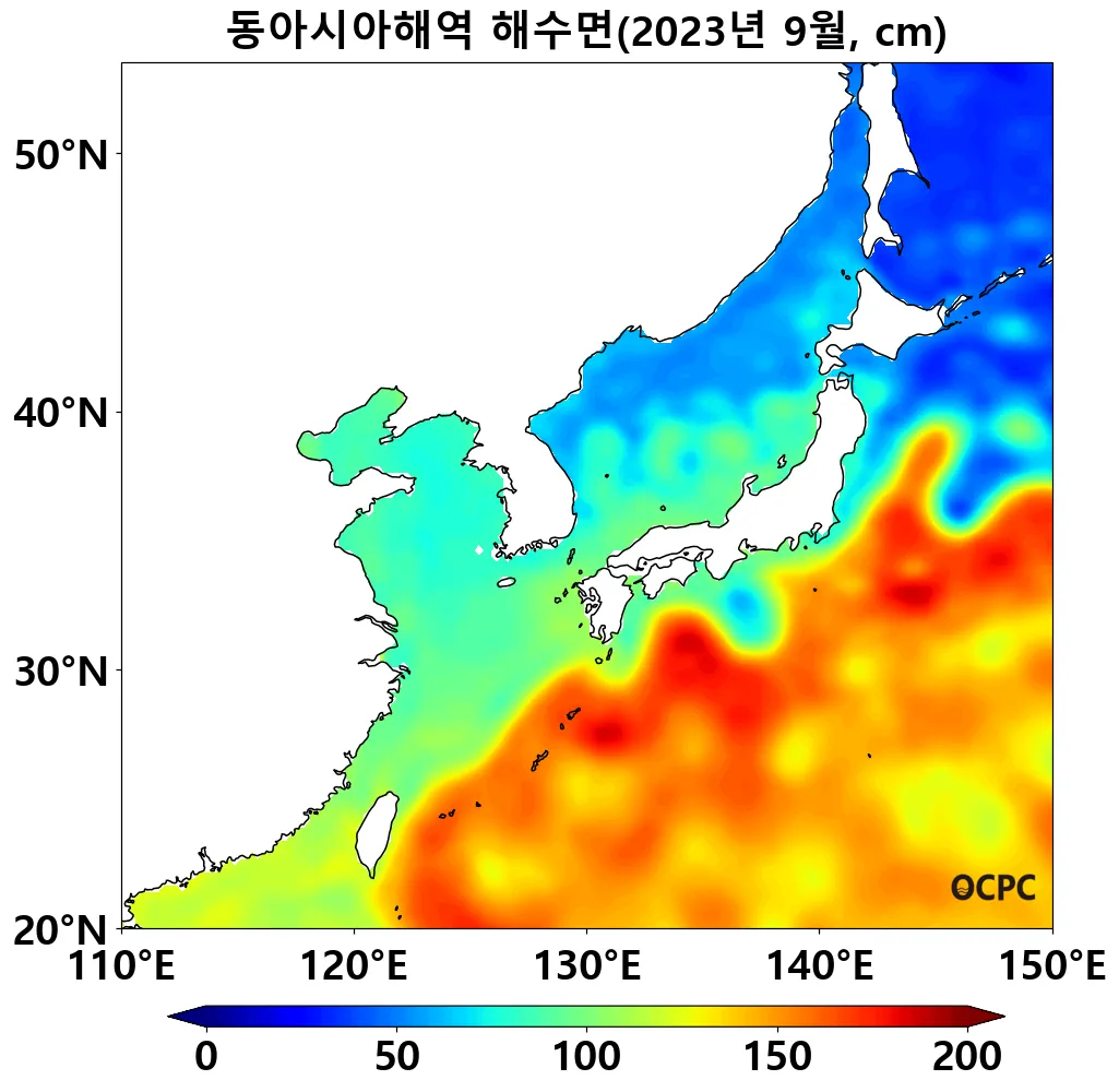 동해, 황해, 동중국해의 해수면은 평년(57.9±4.6cm, 72.8±4.8cm, 97.5±4.2cm)보다 각각 10.1cm, 9.8cm, 8.9cm 높았으며, 1993~2023년(9월) 중 가장 높았습니다.