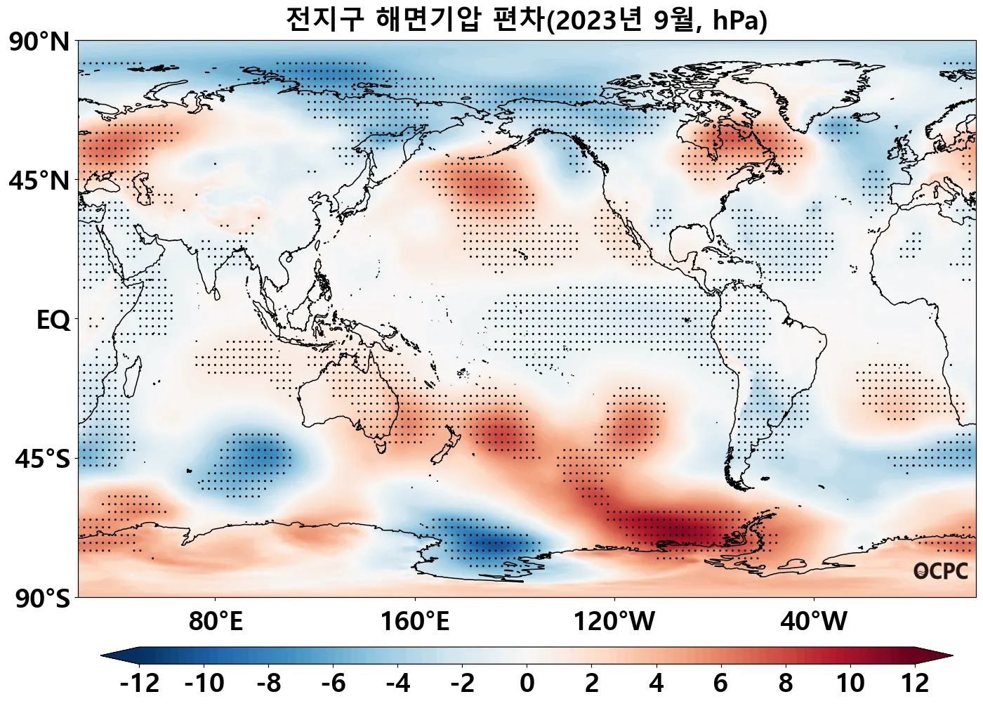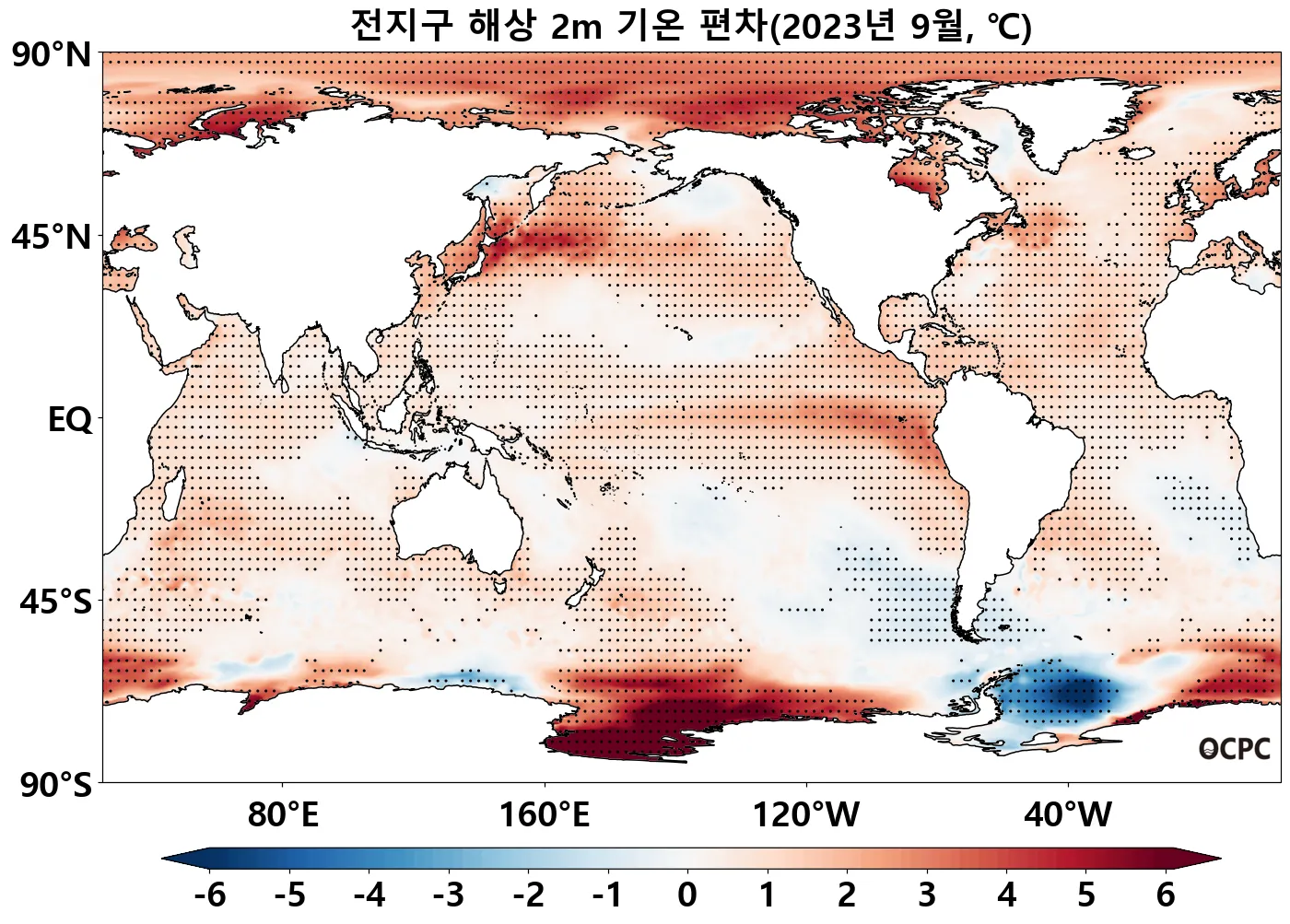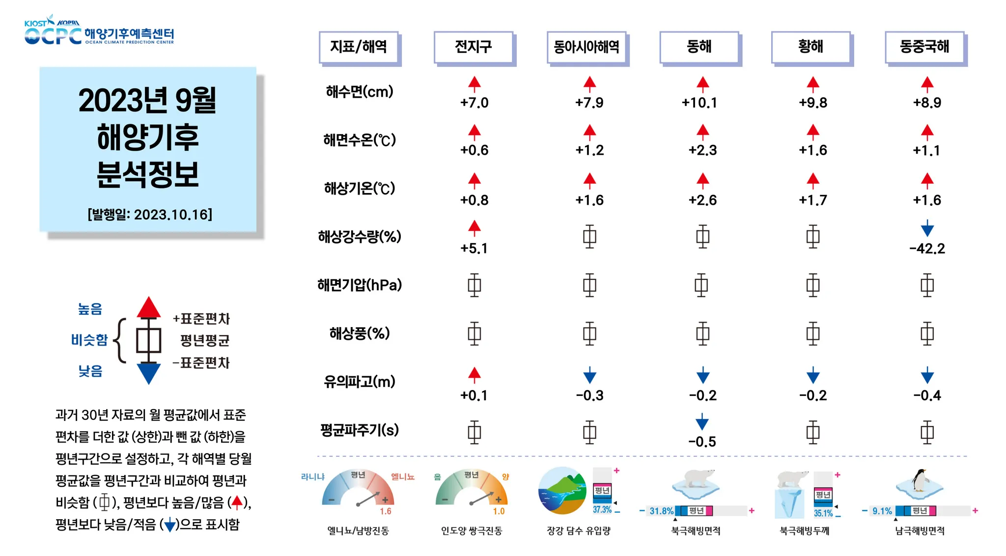 요약 : 전지구 해수면, 해면수온, 해상기온은 역대 9월 중 가장 높았으며, 열대 태평양에서 엘니뇨가 강하게 발달하고 인도양 쌍극진동 지수는 양의 상태입니다. 남극 해빙 면적은 역대 9월 중 가장 작았습니다.
