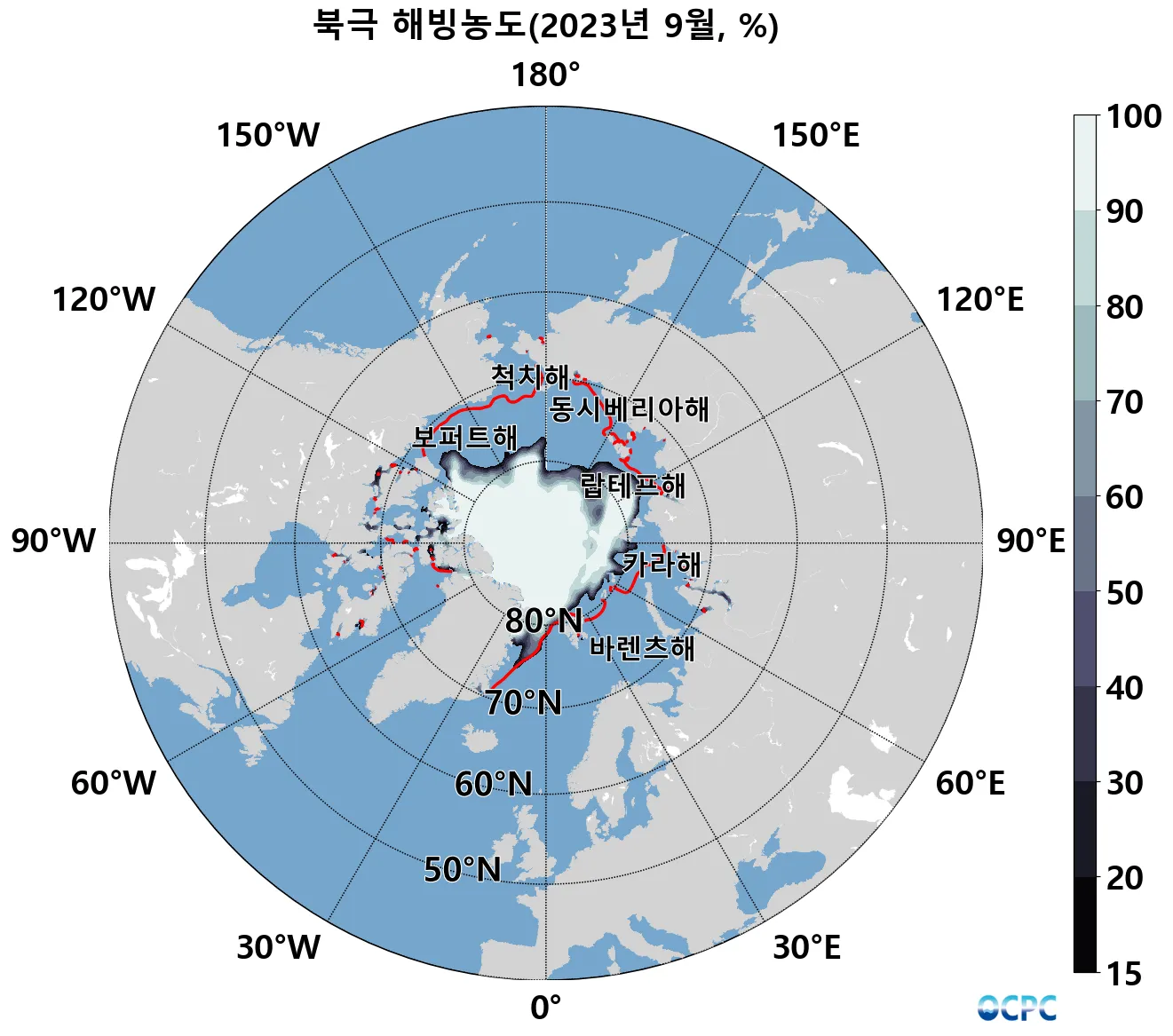 해빙농도 15% 이상 해역, 붉은선(평년 해빙농도 15% 경계)