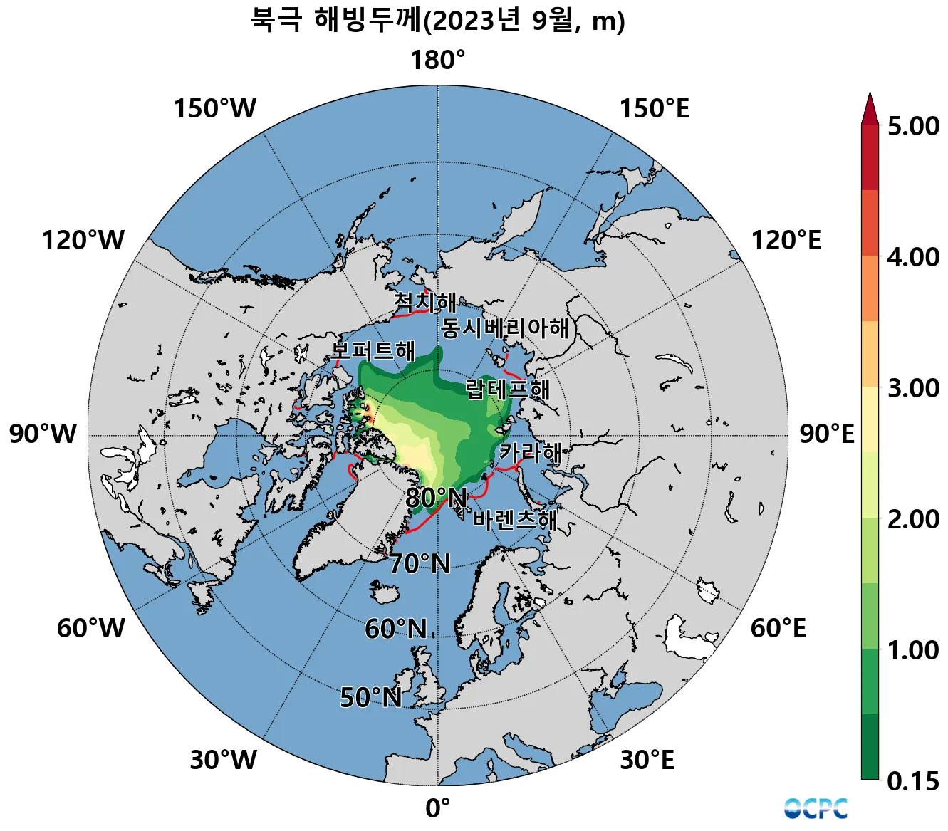 해빙두께 0.15m 이상 해역, 붉은선(평년 해빙두께 0.15m 경계)