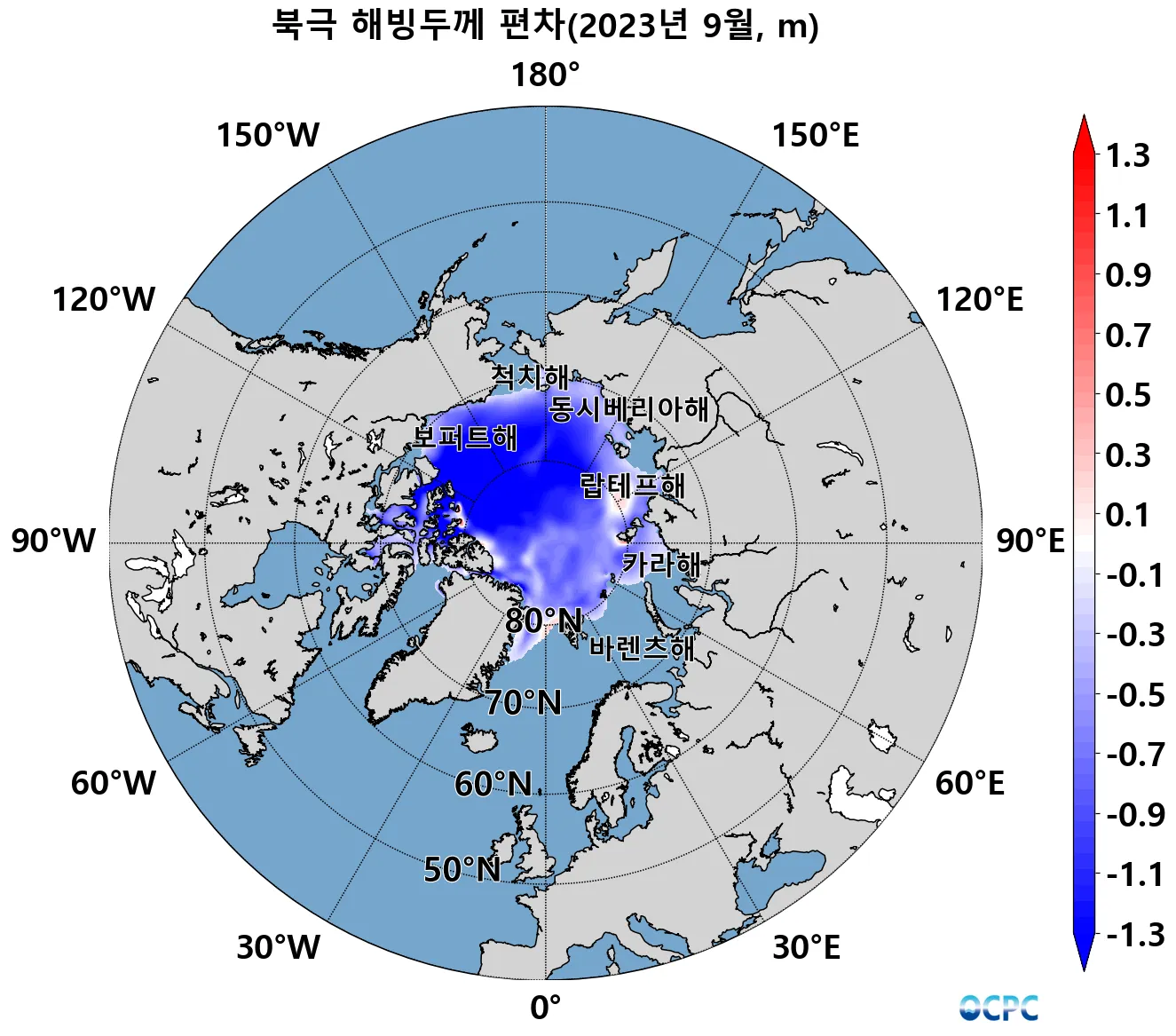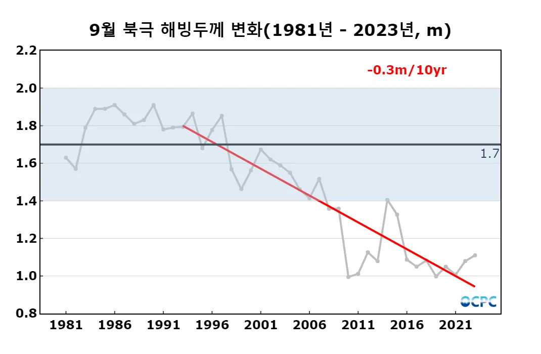9월 북극 해빙두께는 1.1m로 평년(1.7±0.3m) 보다 약 0.6m(35.1%) 감소했으며, 1993~2023년 동안 10년에 0.3m씩 감소하는 추세입니다.