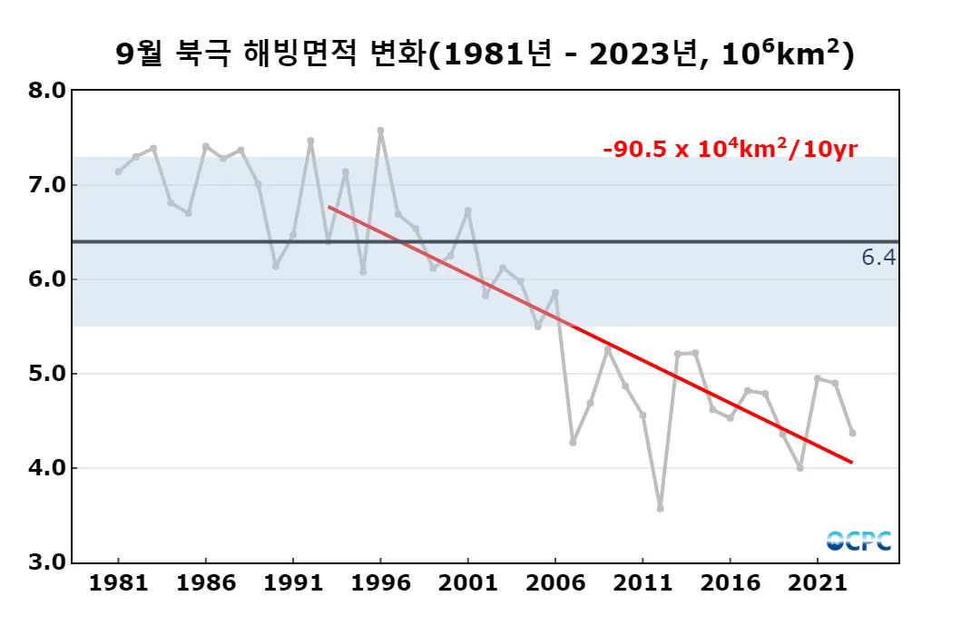 1993~2023년 동안 9월 북극 해빙면적은 10년에 91만km²씩 감소하는 추세입니다.