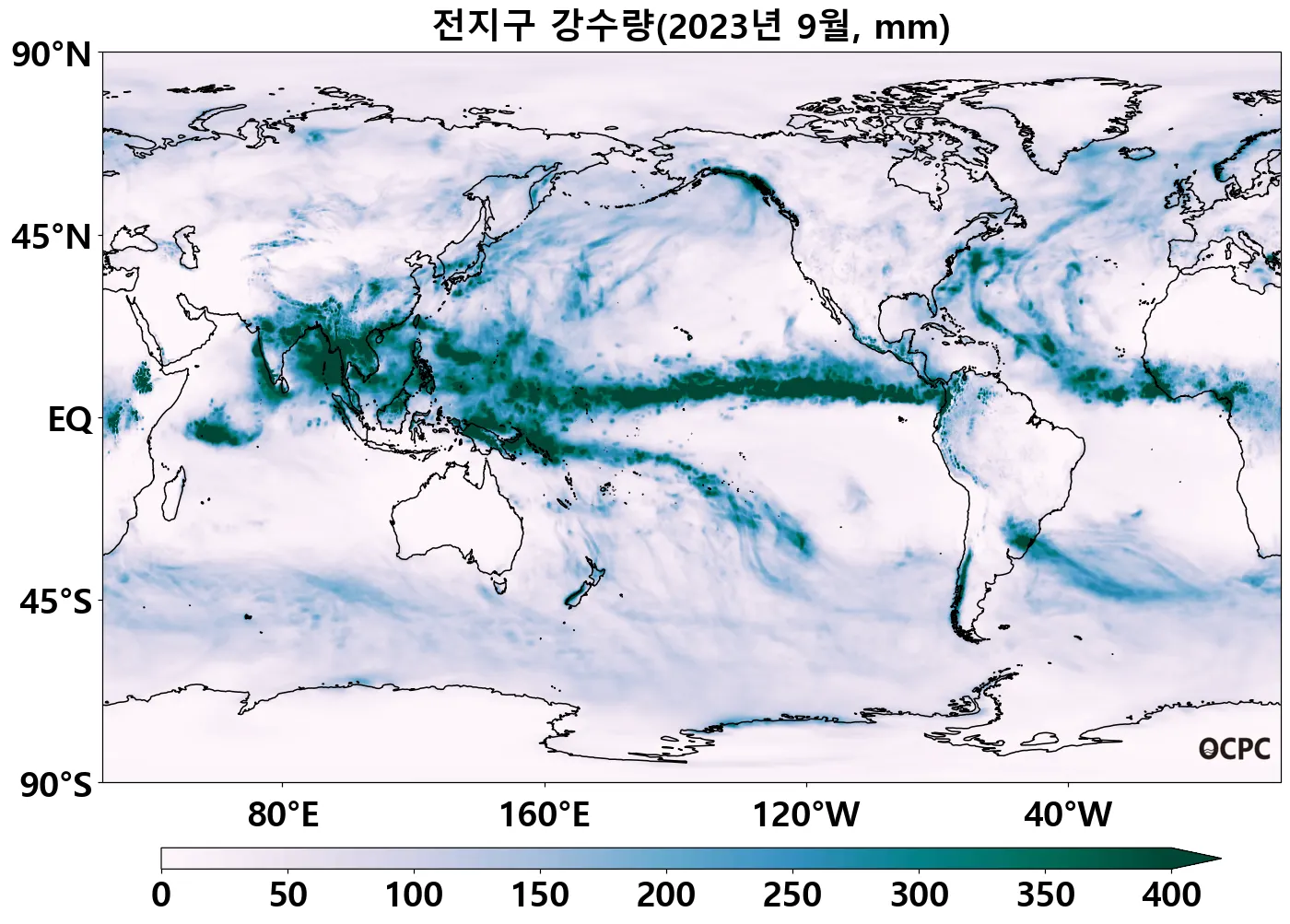 1993~2023년 동안 전지구 9월 해상강수량은 10년에 1.4mm, 동아시아해역는 10년에 3.1mm 증가하는 추세입니다.