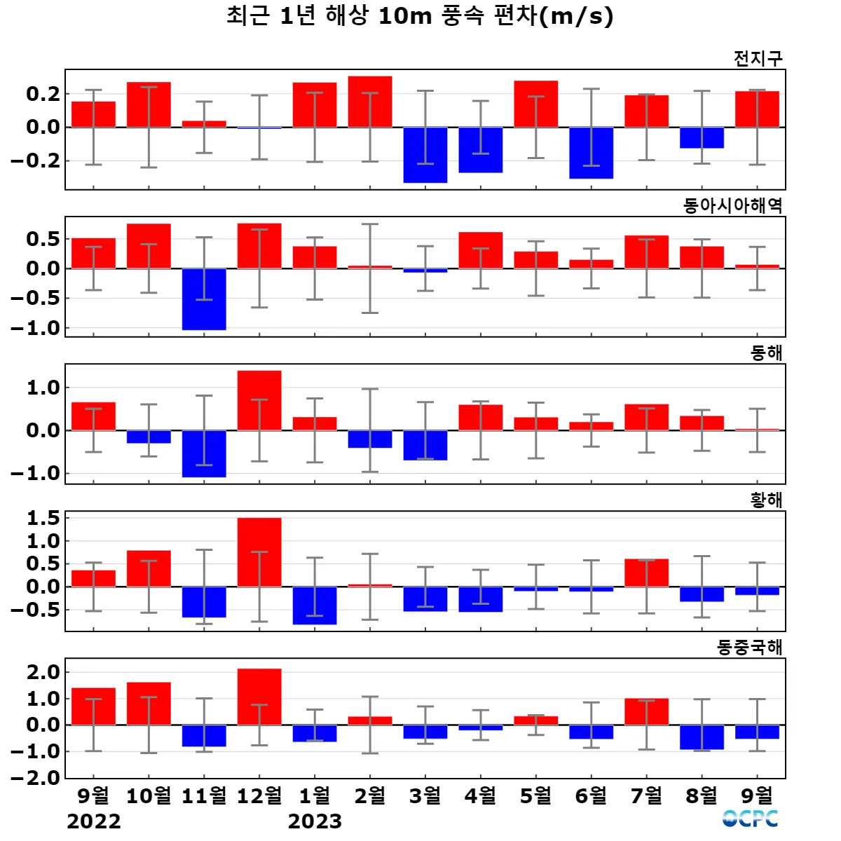 동해, 황해, 동중국해의 해상풍속은 평년(1.8±0.5m/s, 2.0±0.5m/s, 3.5±1.0m/s)과 비슷했습니다.