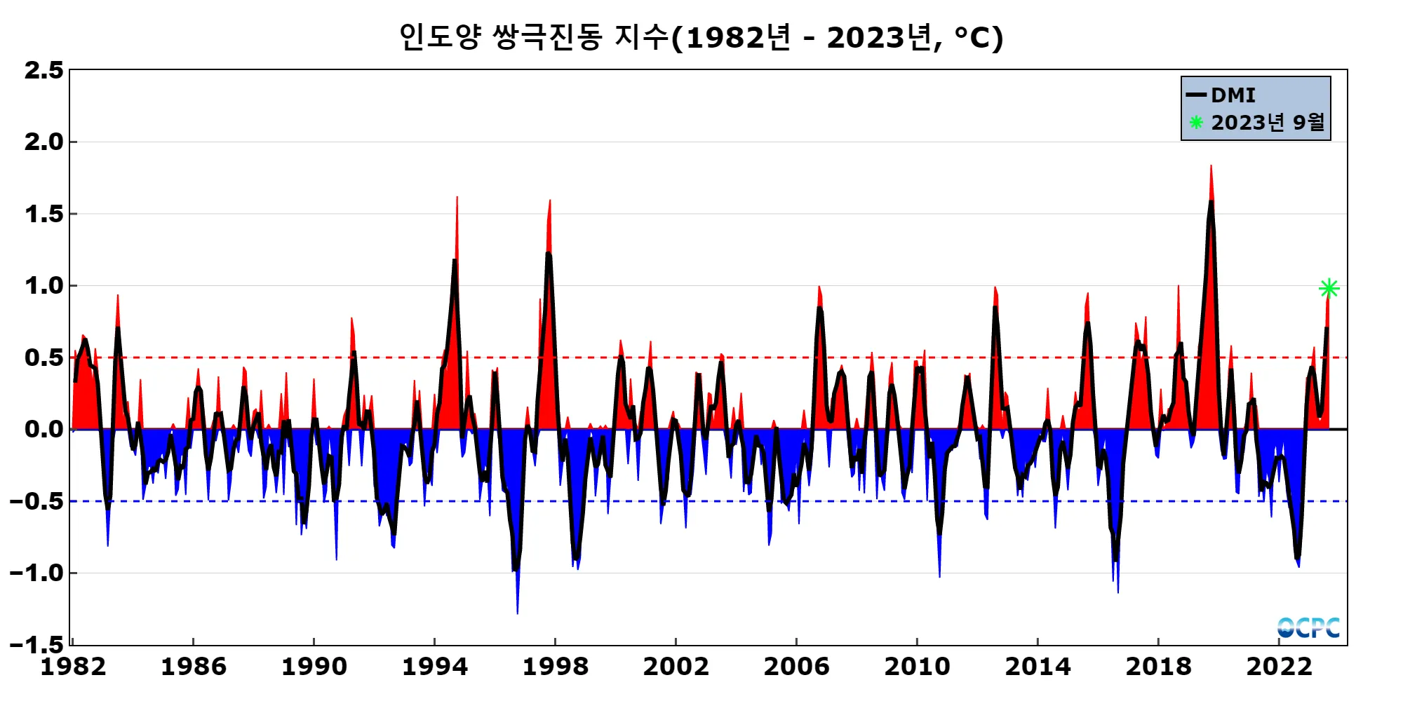 인도양 쌍극진동 지수 DMI (Dipole Mode Index)는 WTIO의 평년 대비 편차에서 SETIO의 평년 대비 편차를 뺀 값으로 월 평균 지수(채색부분)를 3개월 이동평균하여 나타낸 지수(검정선)가 0.5보다 크면 양의 상태로, -0.5보다 작으면 음의 상태로 판정합니다. OCPC 월간 분석정보에서는 당월 평균 지수만을 이용해서 잠정적으로 판정합니다.
