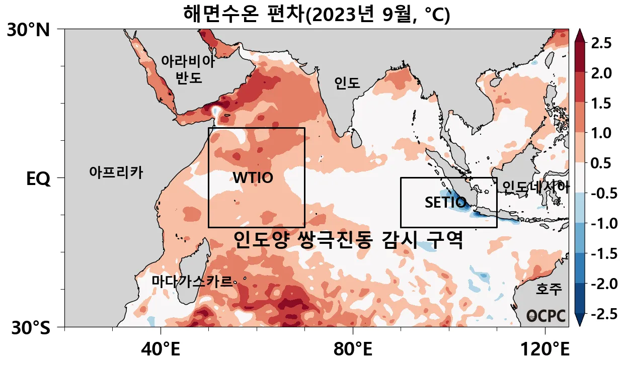 2023년 9월 평균 해면수온의 평년 대비 편차(사각형은 인도양 쌍극진동 감시구역으로 각각 WTIO(열대서인도양), SETIO(열대 남동인도양) 해역이며, 인도양 쌍극진동 지수(DMI: Dipole Mode Index)는 WTIO의 평년 대비 편차에서 SETIO의 평년 대비 편차를 뺀 값입니다.)