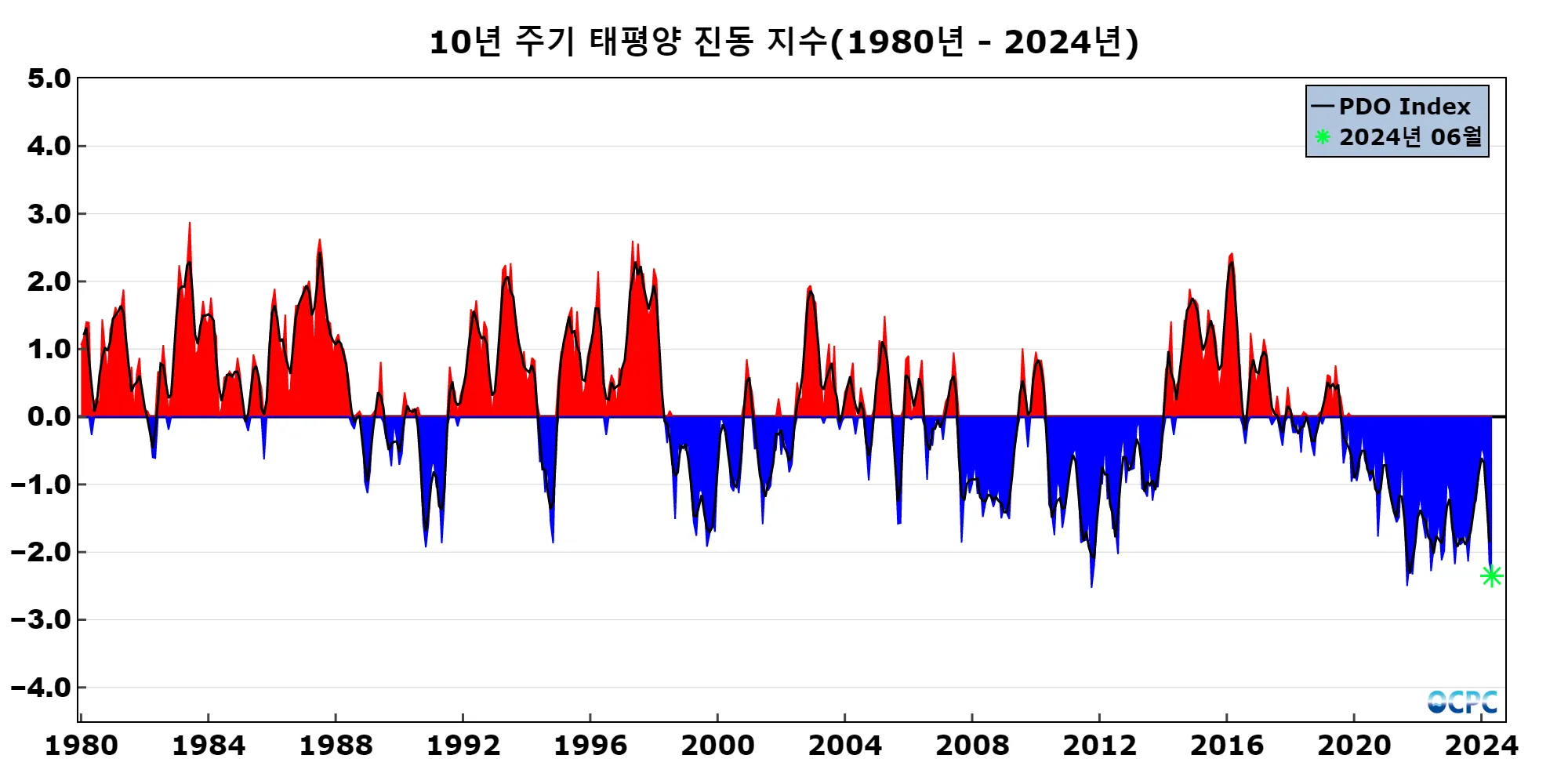 ㅇ 북태평양의 해수면 온도가 수십년에 걸쳐 주기적으로 변화하는 현상. 이 변동은 일반적으로 20년에서 30년 주기로 해양과 대기의 상호작용에 의해 발생함