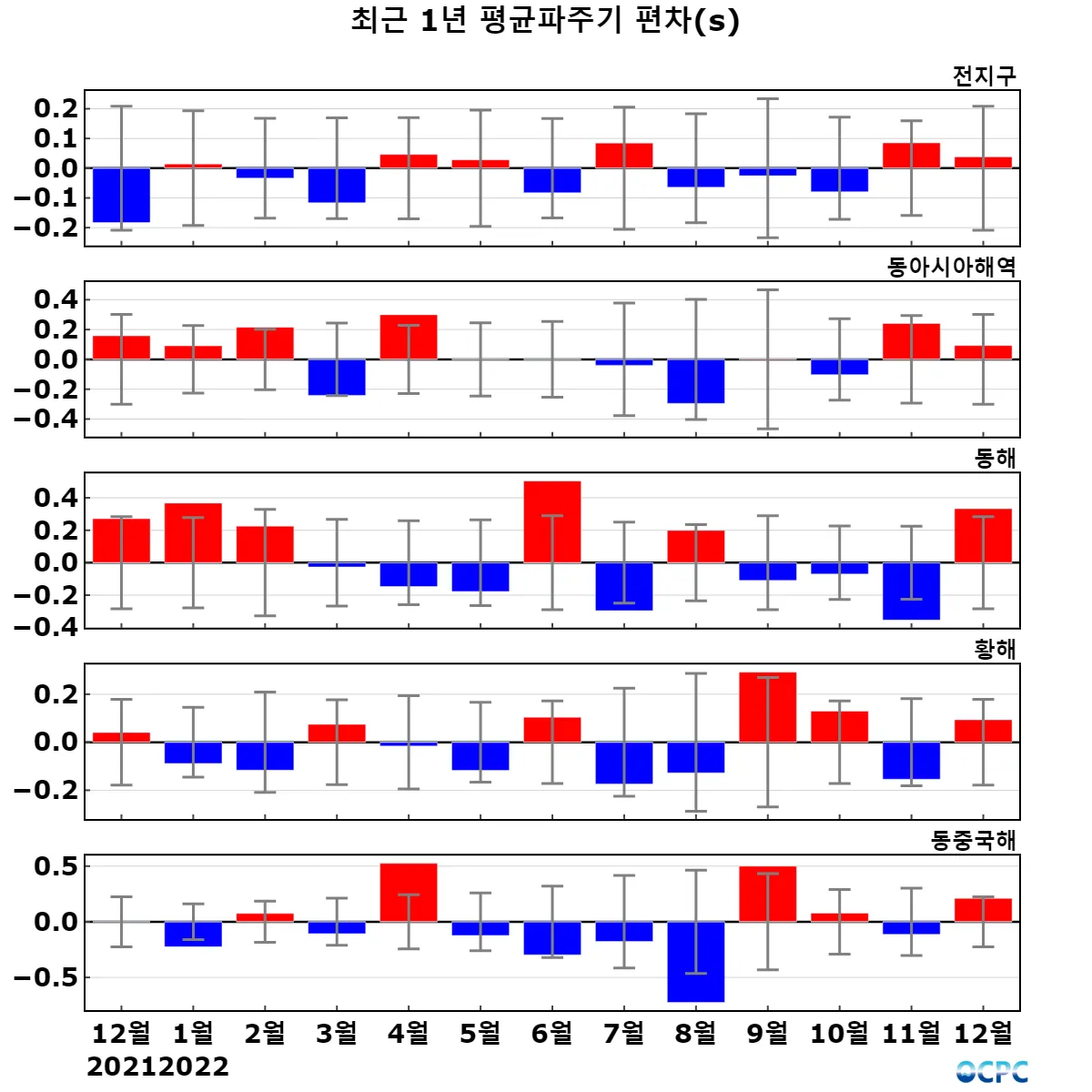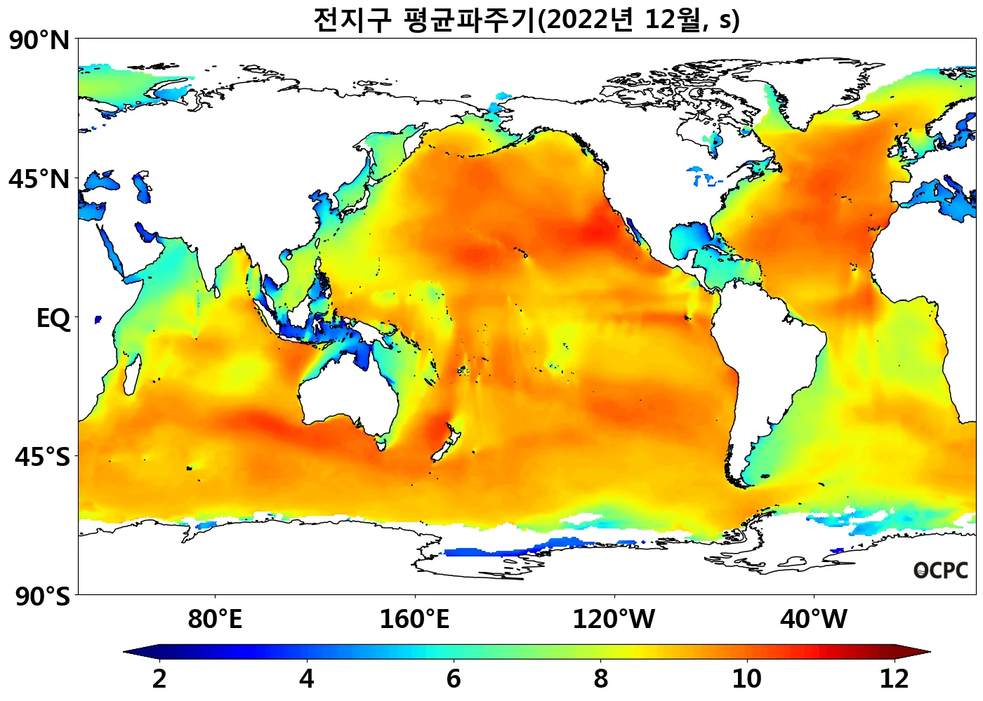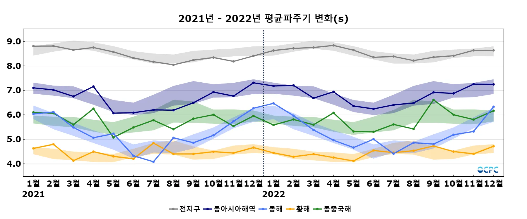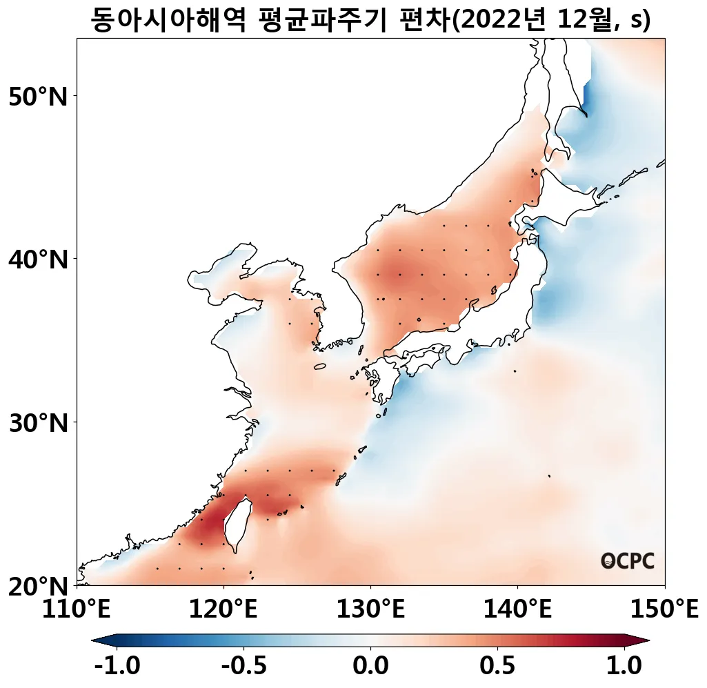 동해의 평균파주기는 평년(6.0초)보다 0.3초 증가했고, 황해, 동중국해는 평년(4.6초, 6.0초)과 비슷했습니다.