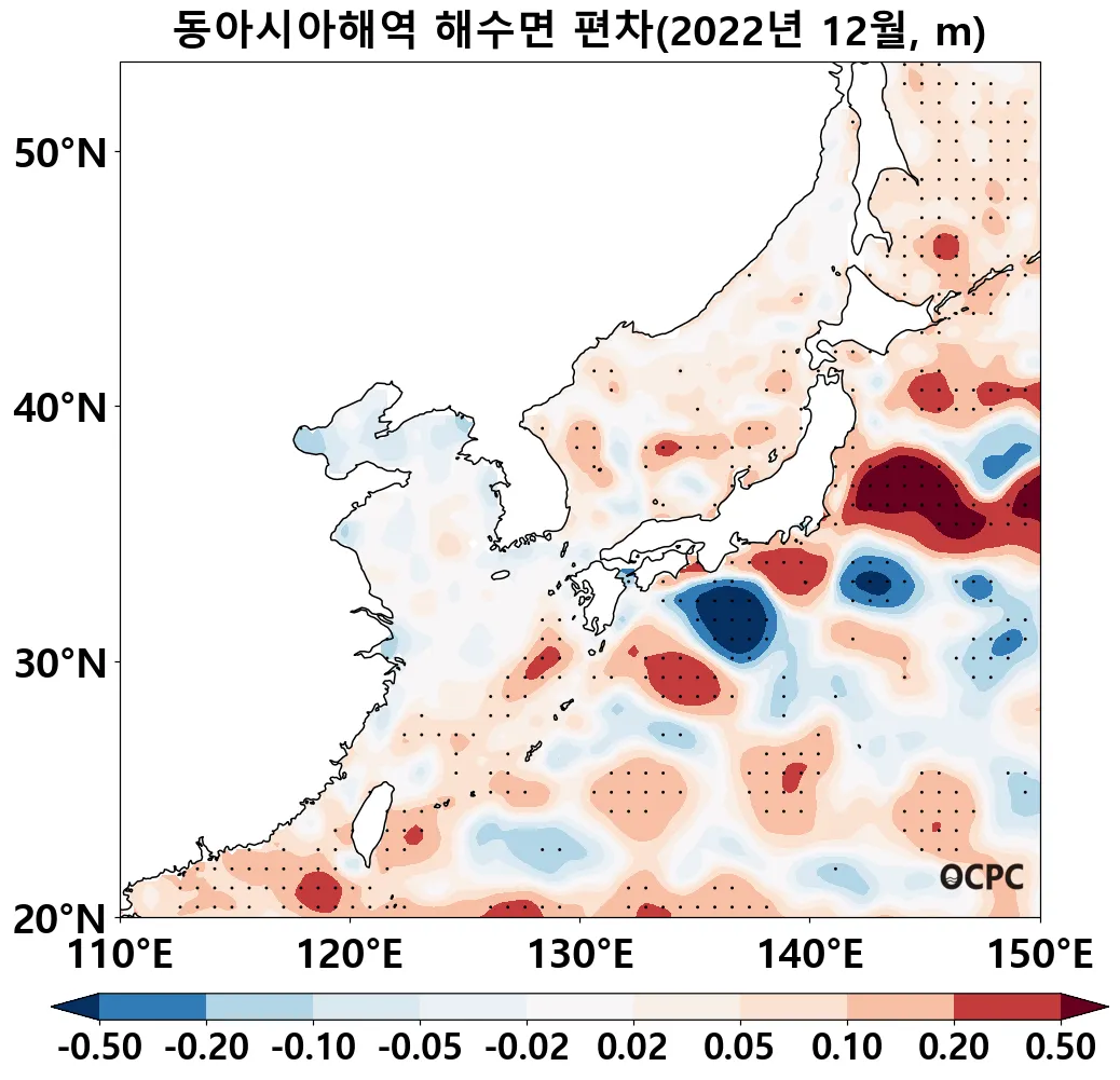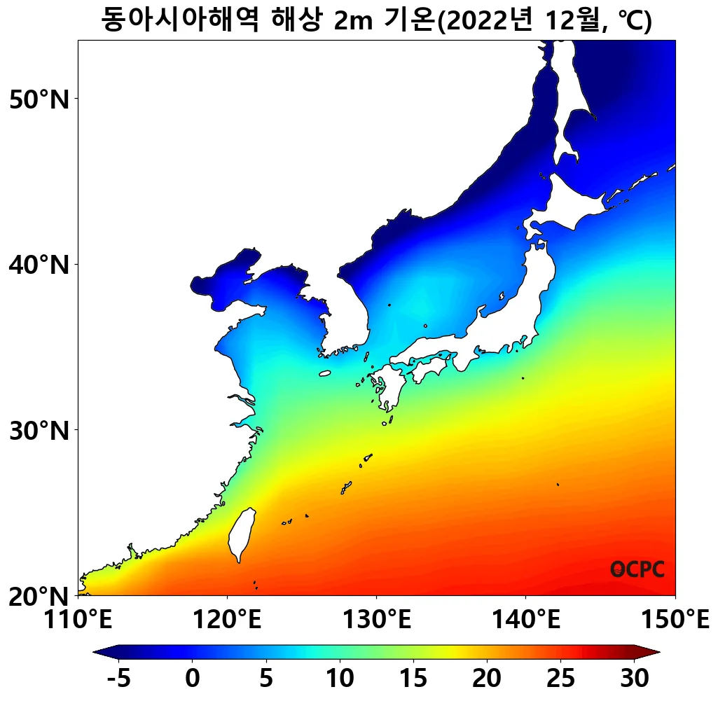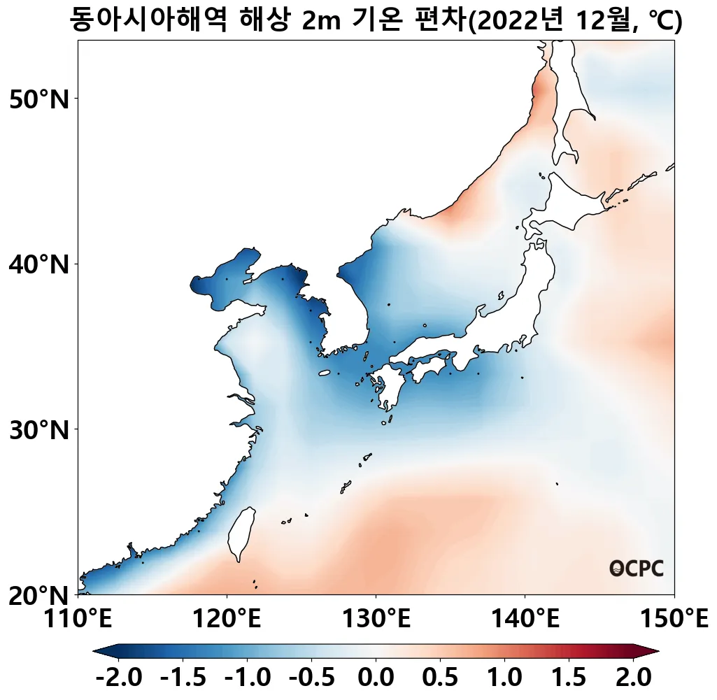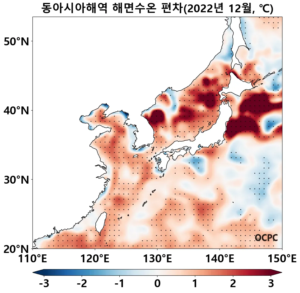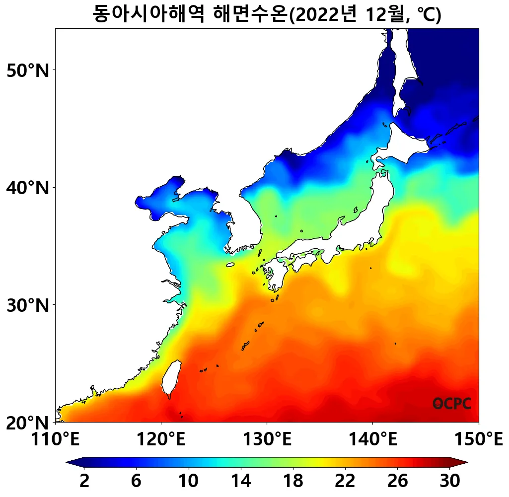 동해는 평년(9.5°C)보다 1.6°C 높아 1982~2022년(12월) 중 가장 높았으며, 황해는 평년(10.6°C)보다 1.0°C 높았고 동중국해는 평년(20.1°C)보다 0.9°C 높아 1982~2022년(12월) 중 가장 높았습니다.