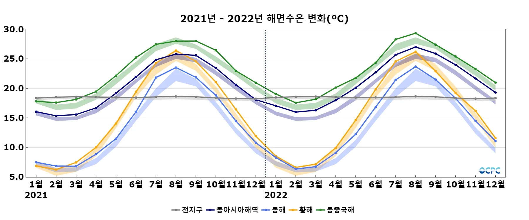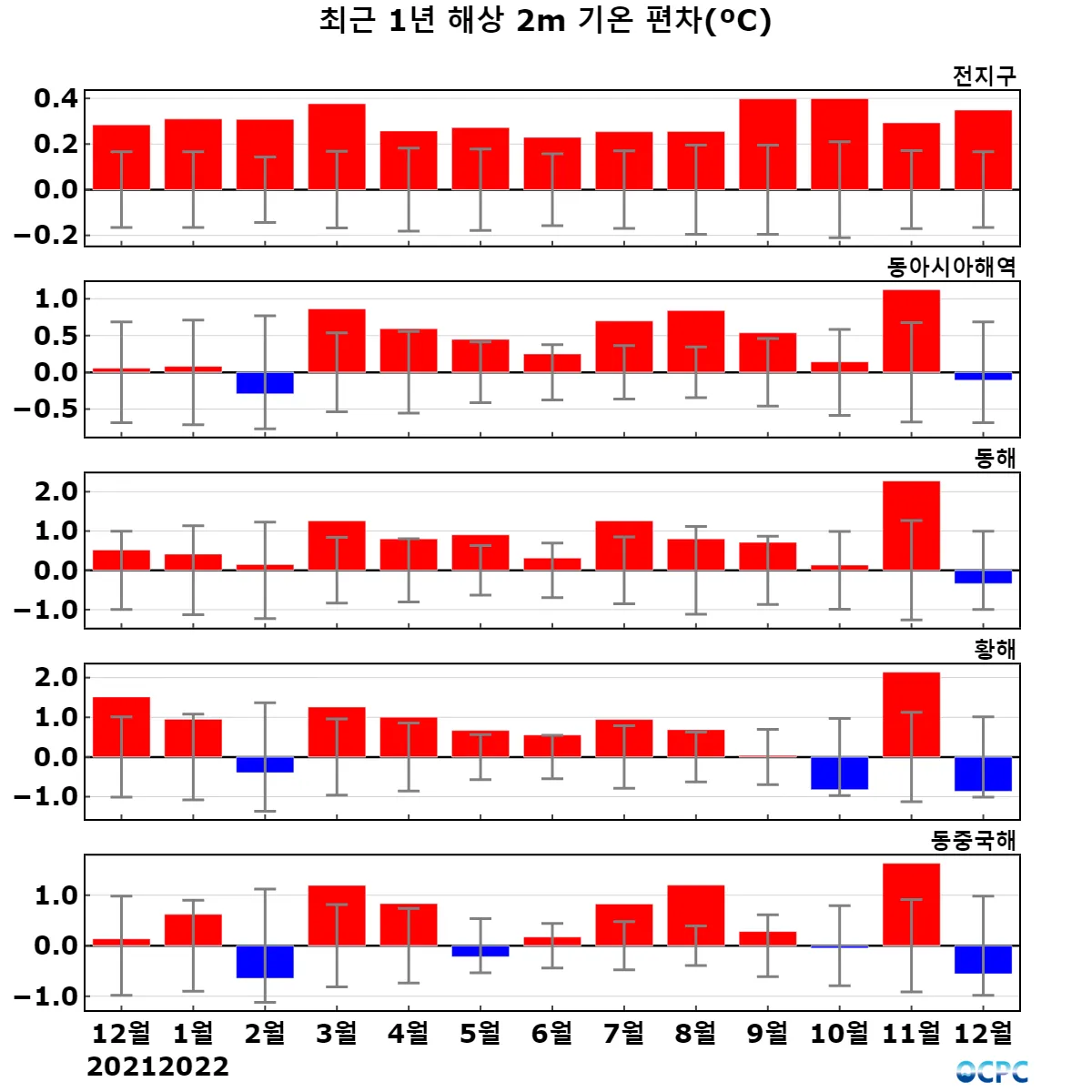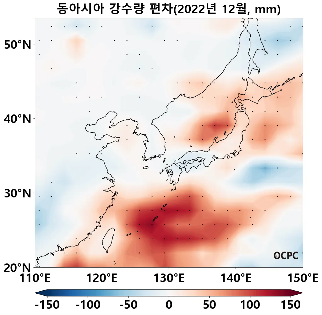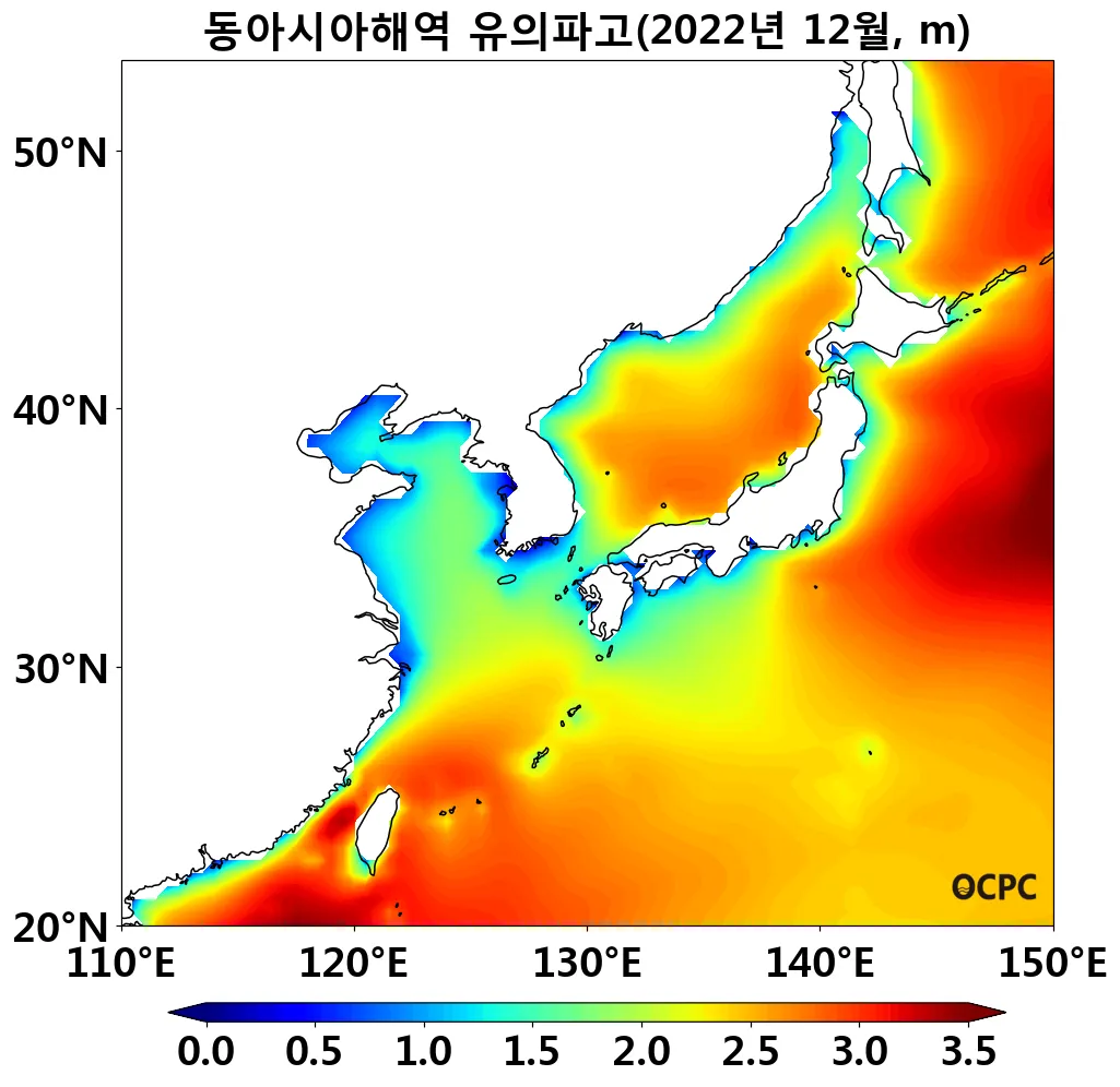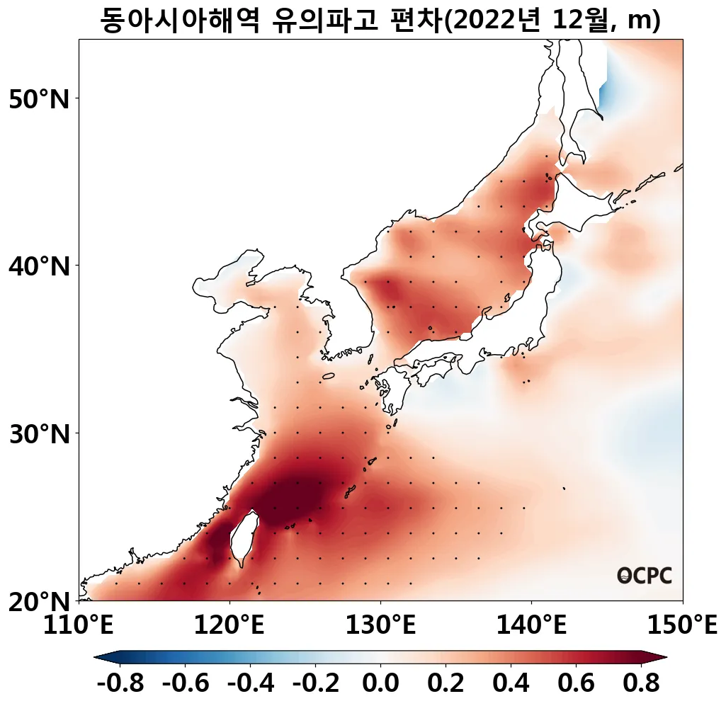 동해는 평년(9.5°C)보다 1.6°C 높아 1982~2022년(12월) 중 가장 높았으며, 황해는 평년(10.6°C)보다 1.0°C 높았고 동중국해는 평년(20.1°C)보다 0.9°C 높아 1982~2022년(12월) 중 가장 높았습니다.