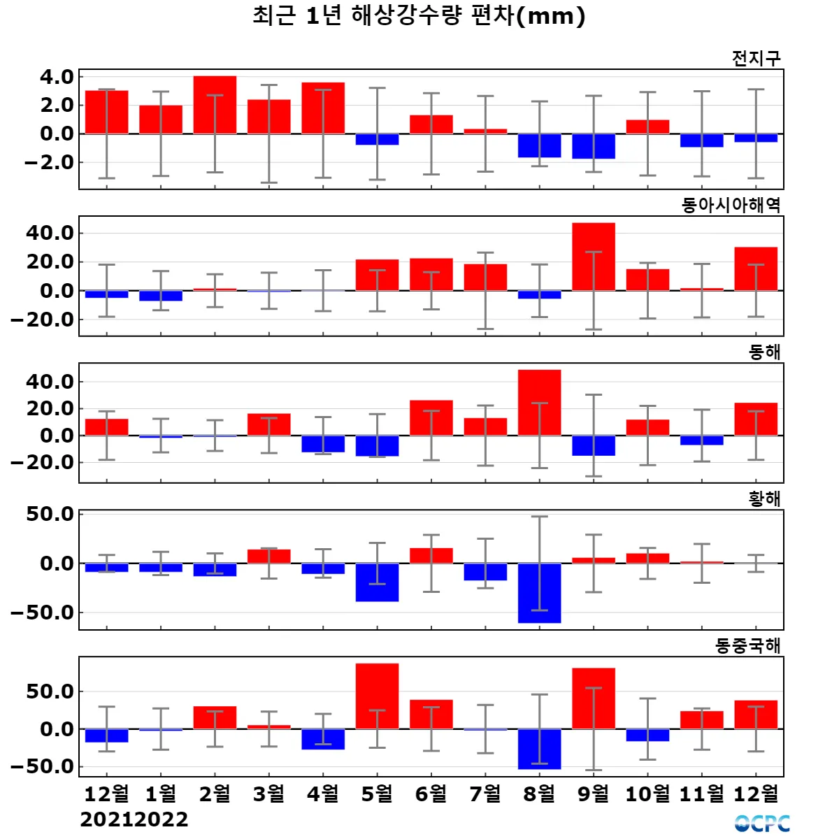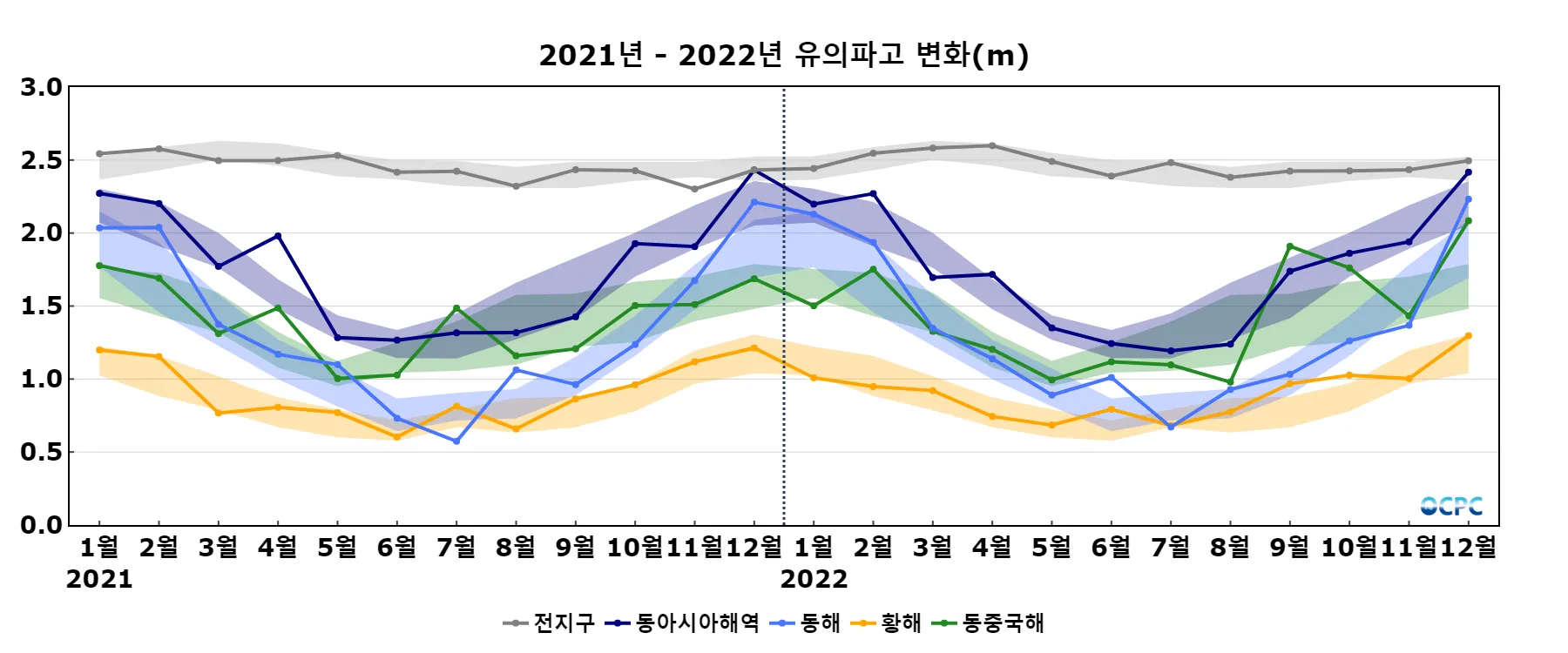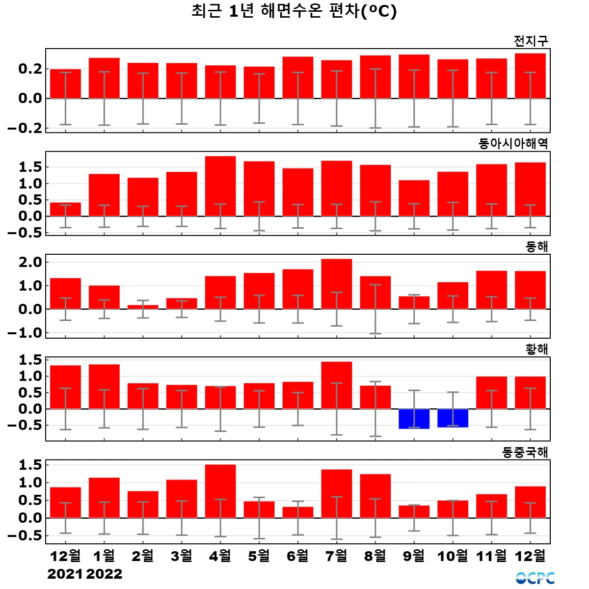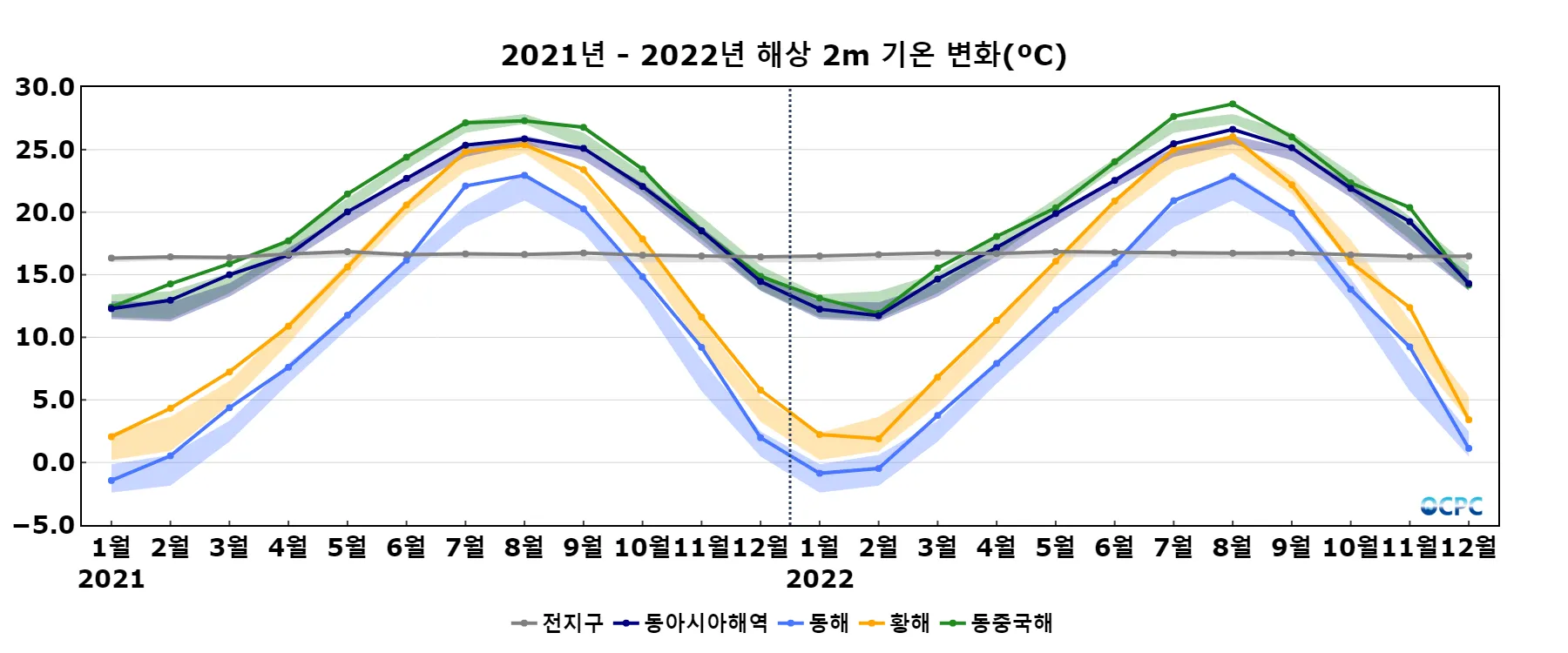 동해는 평년(9.5°C)보다 1.6°C 높아 1982~2022년(12월) 중 가장 높았으며, 황해는 평년(10.6°C)보다 1.0°C 높았고 동중국해는 평년(20.1°C)보다 0.9°C 높아 1982~2022년(12월) 중 가장 높았습니다.