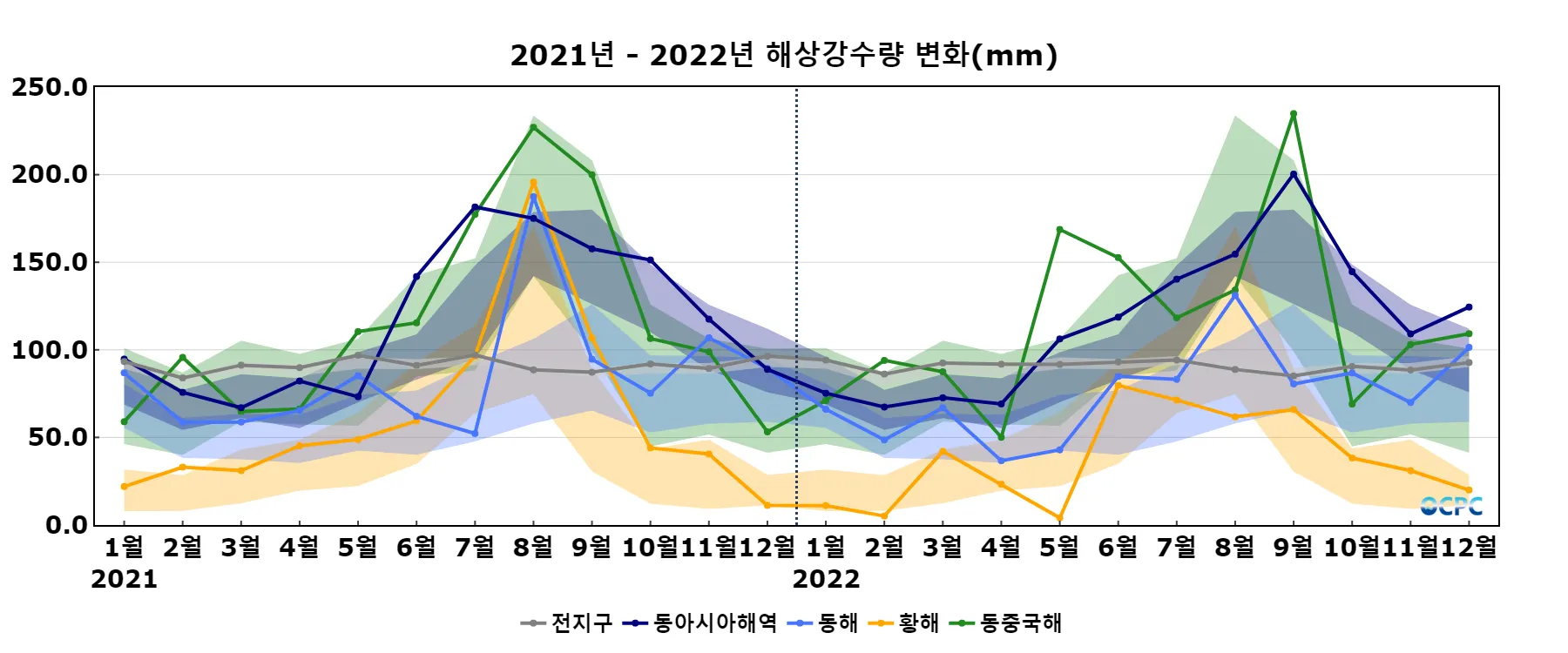 동해, 동중국해의 해상강수량은 평년(77.0mm, 70.9mm)보다 각각 24.4mm(31.7%), 38.3mm(54.0%) 많았으며, 황해는 평년(20.0mm)과 비슷했습니다.