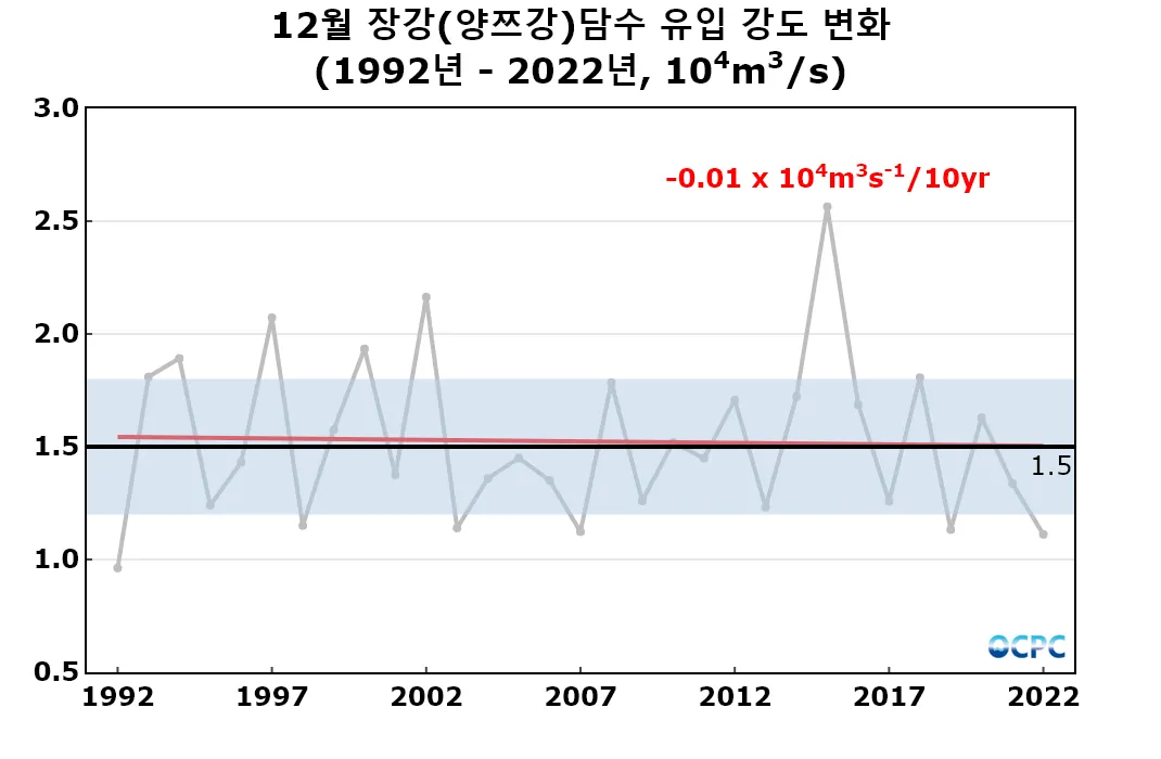 1992~2022년 동안 12월 장강 담수 유입 강도는 10년에 초당 100톤(한 달 동안 유입된 담수량으로 환산하면 10년에 0.3기가톤)씩 감소하는 추세입니다.