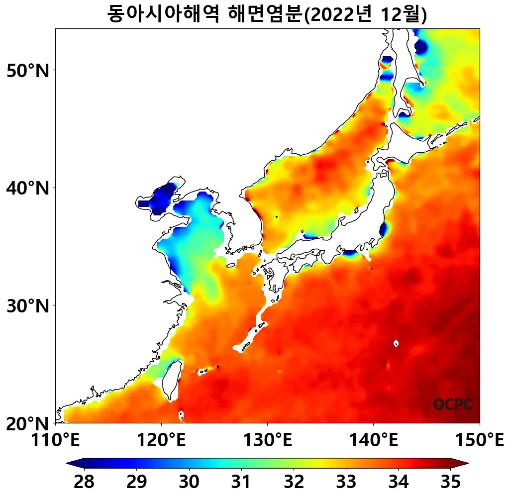 인공위성 추정 12월 해면염분 분석 결과 11월과 비교하여 장강 하구역 및 제주 해역에선 유사한 해면염분 분포를 보이고 황해의 저염분수(약 31~32psu)가 동중국해로 남하하는 양상을 띠고 있습니다.