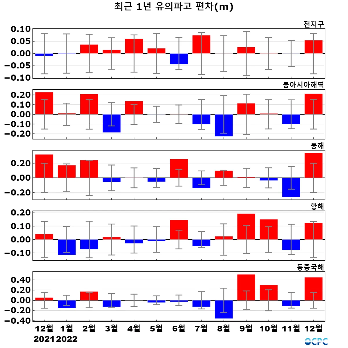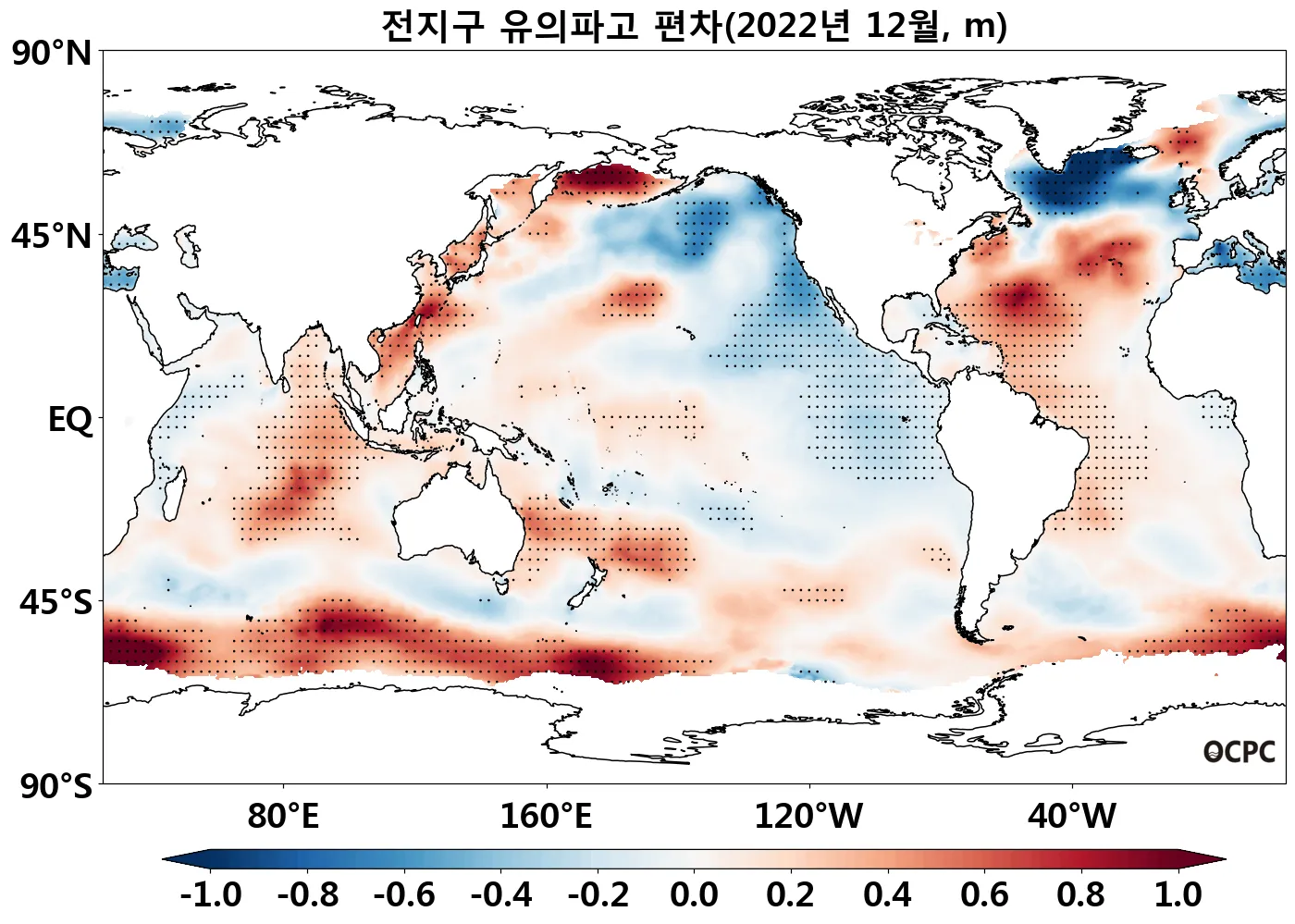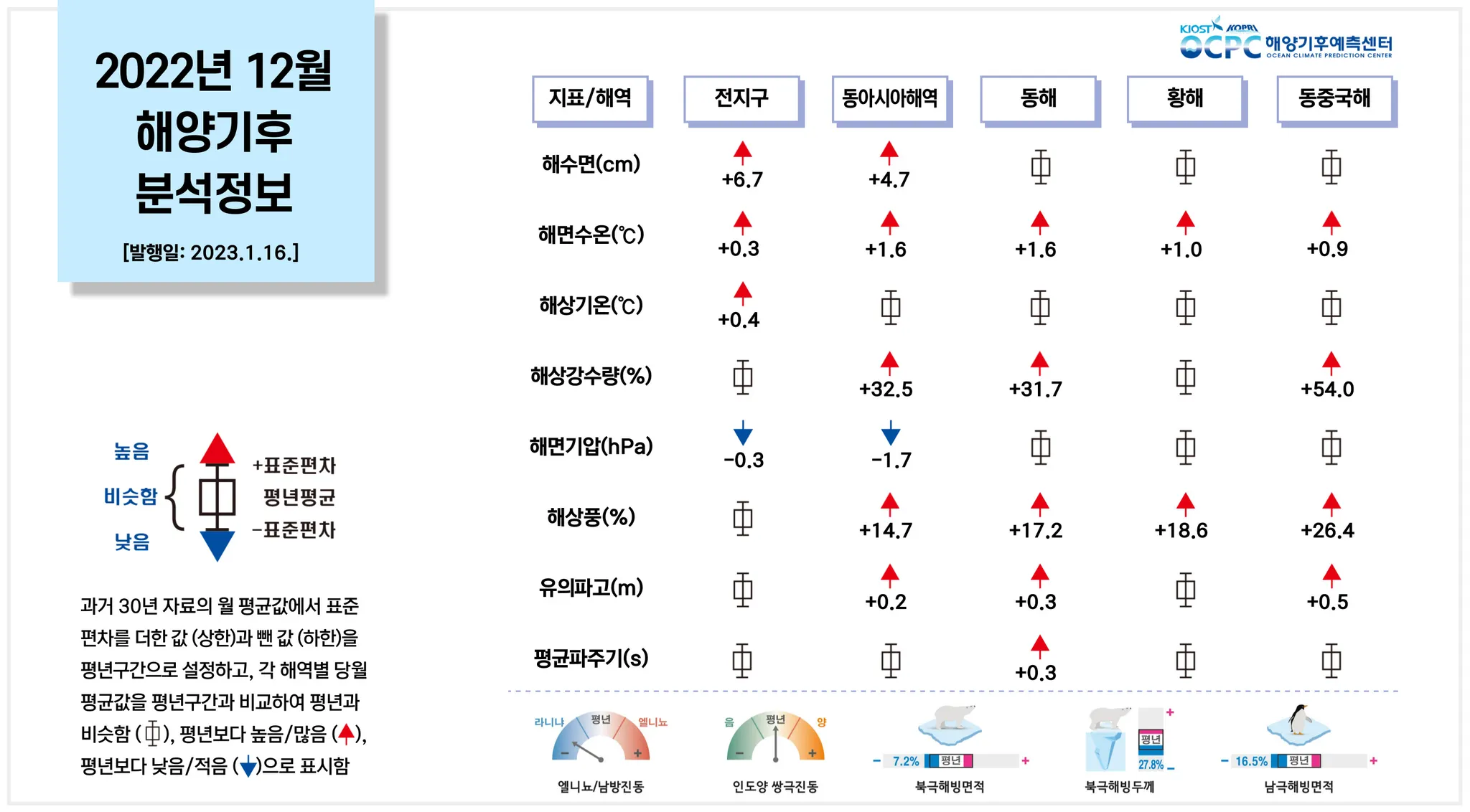 [해면수온] 전지구와 동아시아해역의 해면수온은 평년보다 0.3~1.6°C 높았습니다. 특히 동아시아해역과 동중국해, 그리고 동해는 1982~2022년(12월) 중 가장 높았습니다.