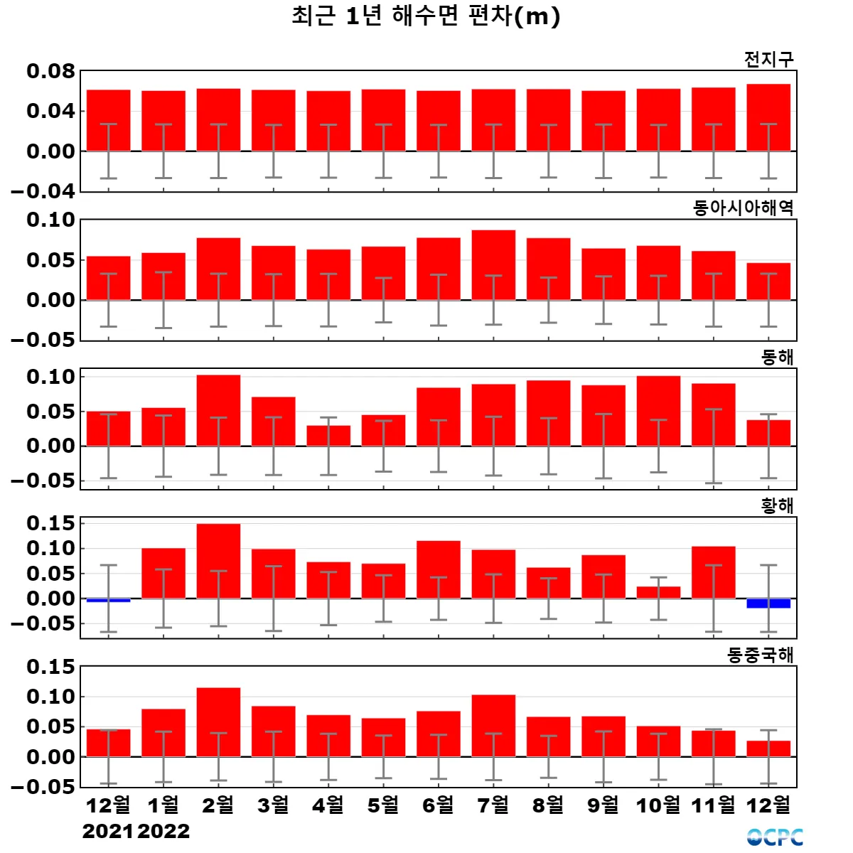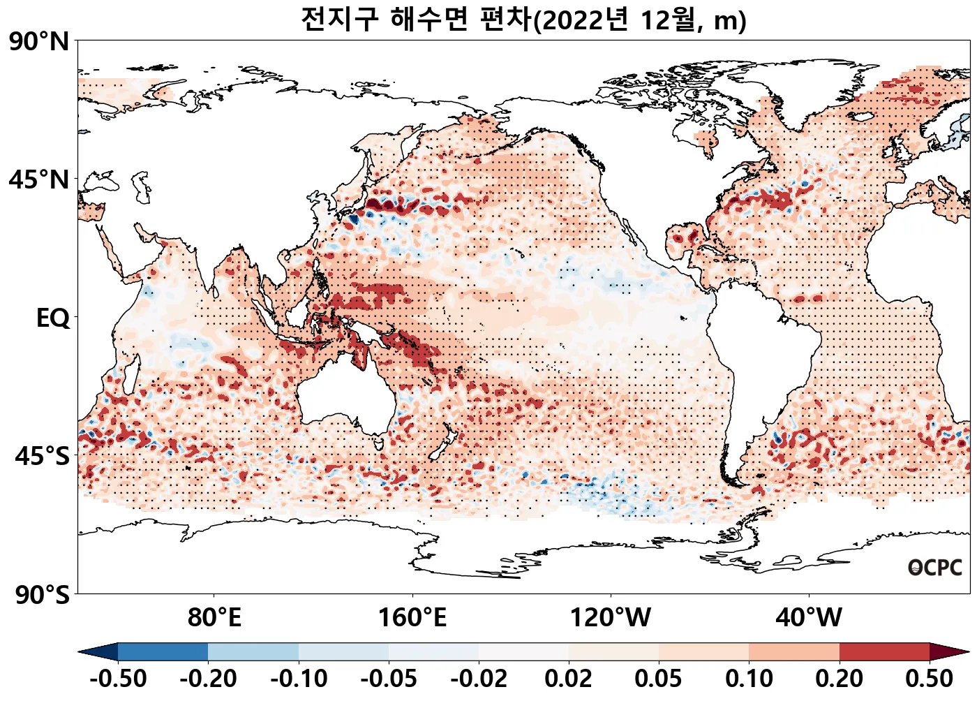 [해수면] 전지구, 동아시아해역의 해수면은 평년보다 4.7~6.7cm 높았으며, 동해, 황해, 동중국해는 평년과 비슷했습니다. 전지구의 해수면은 1993~2022년(12월) 중 가장 높았습니다.