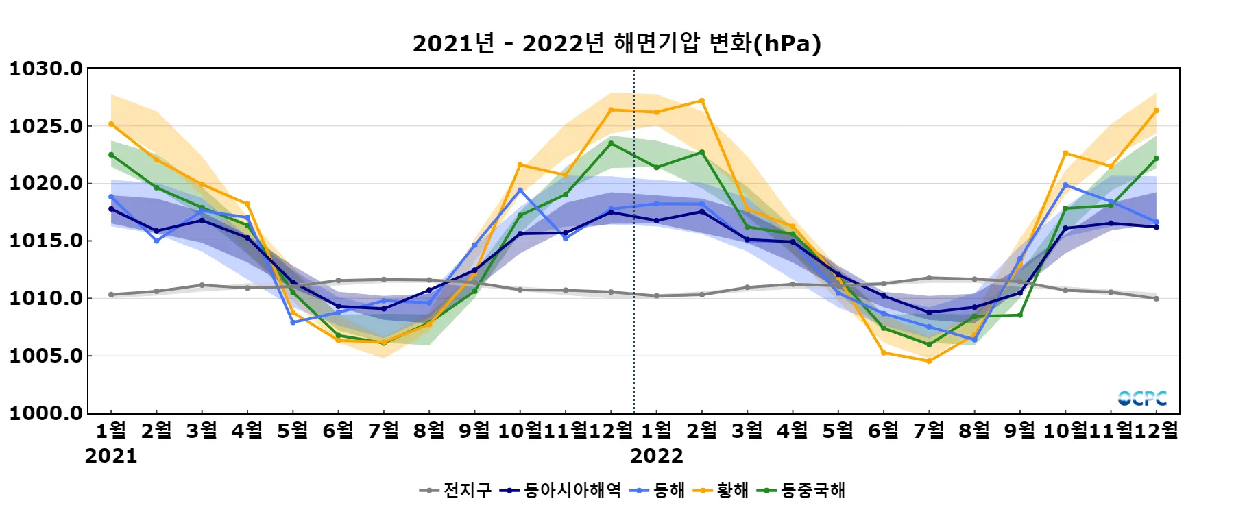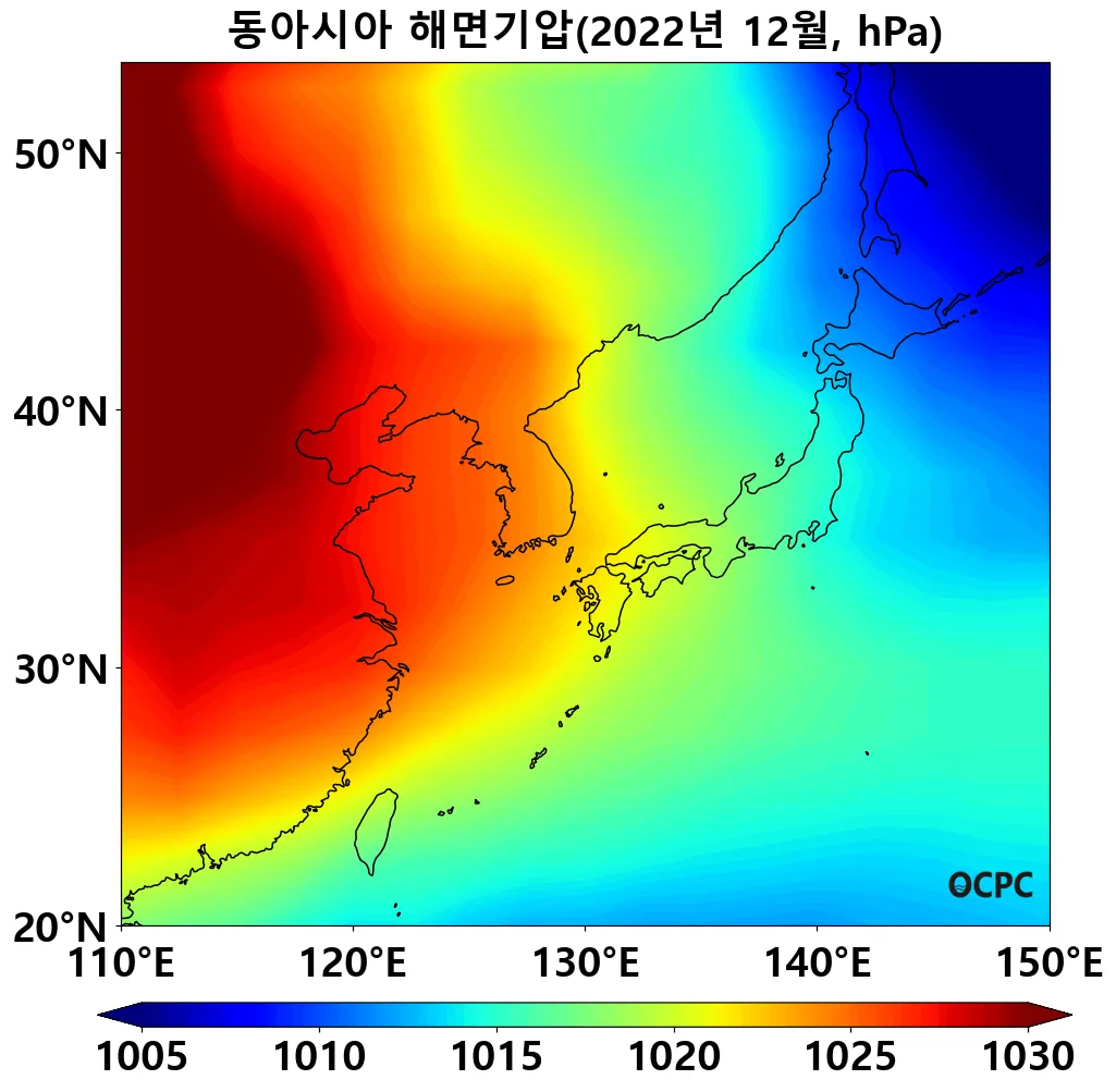 동해, 황해, 동중국해의 해면기압은 평년(1018.5hPa, 1026.1hPa, 1022.8hPa)과 비슷했습니다.