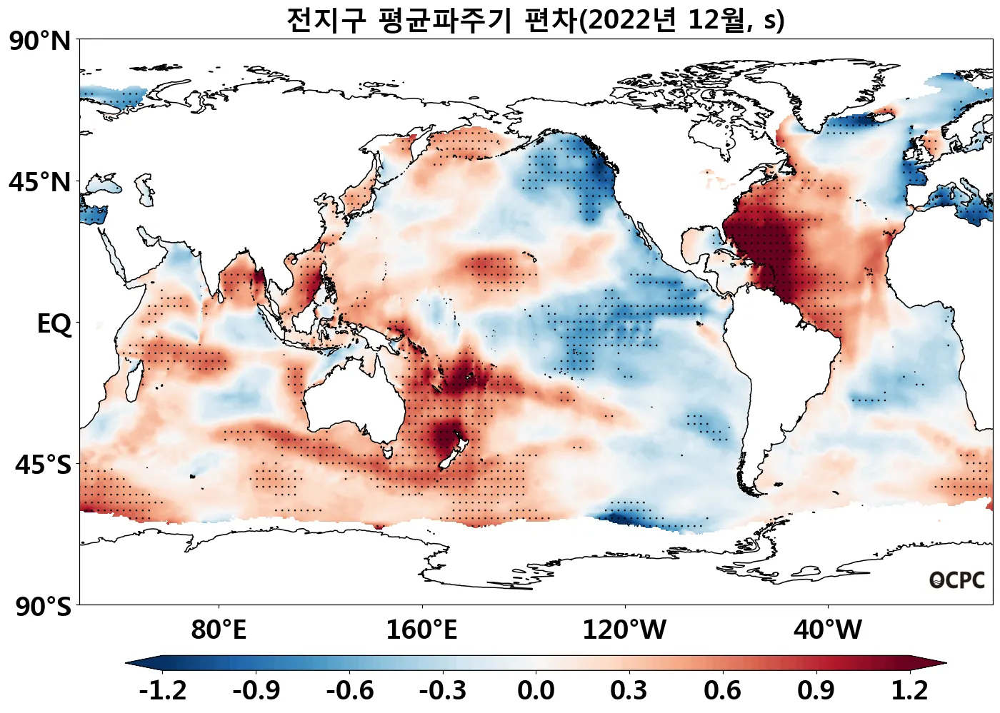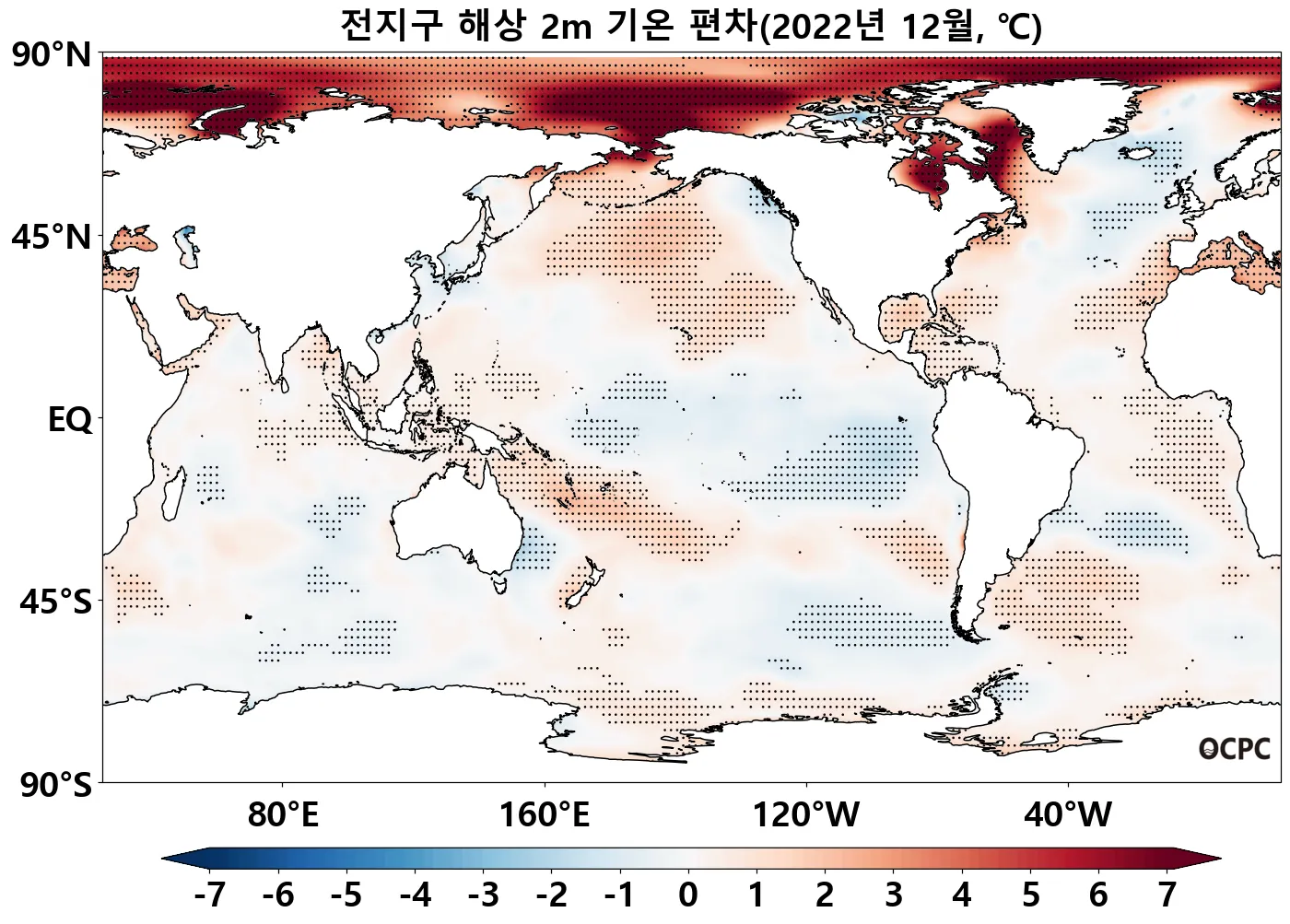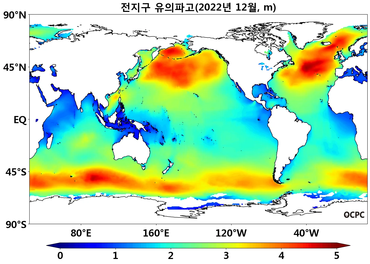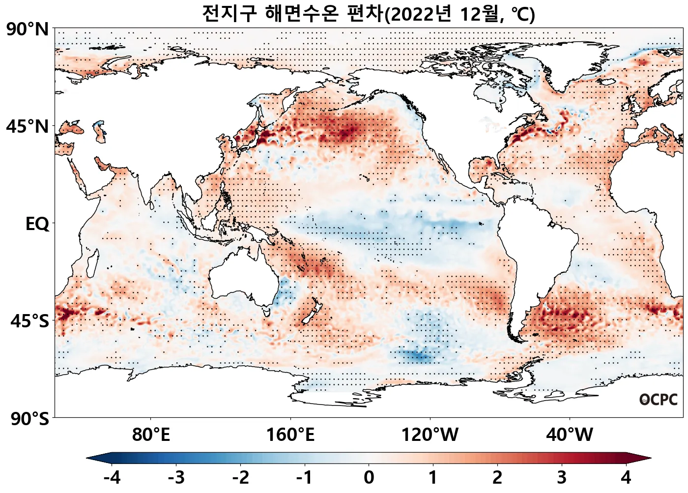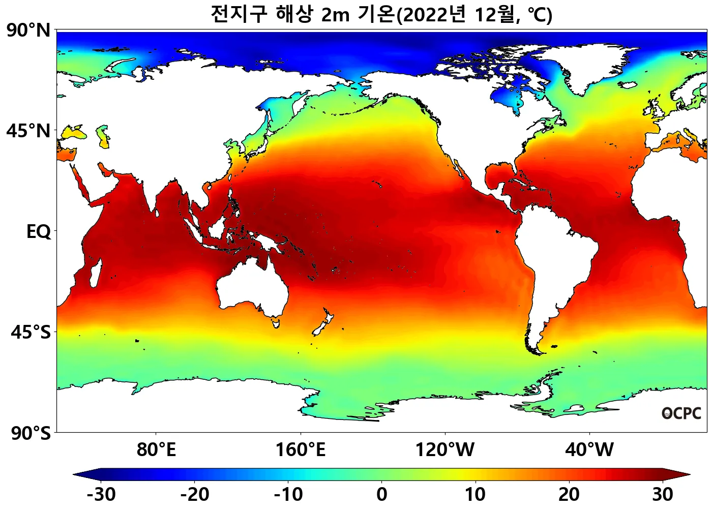 특히 북태평양 중위도 해역과 남대서양(30°S~60°S)의 해면수온이 높았으며, 열대 태평양(0~30°S)은 낮았습니다.
