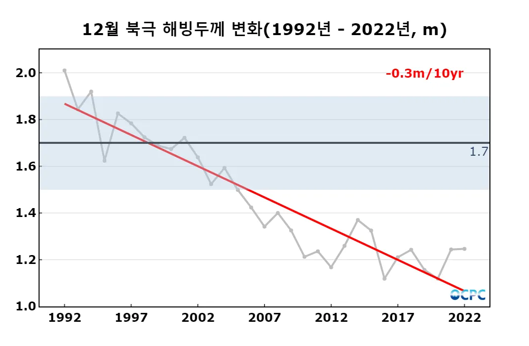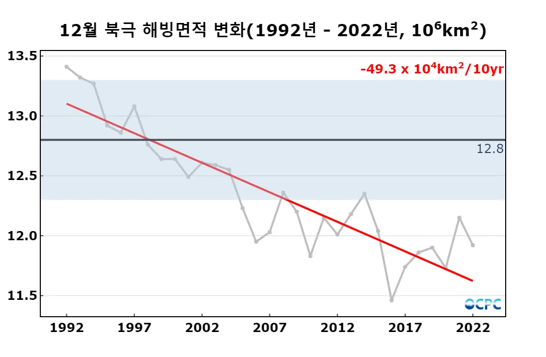 12월 해빙면적은 척치해~베링해, 바렌츠해~카라해에서 평년보다 감소했으며, 1992~2022년 동안 10년에 49.3만km²씩 감소하는 추세입니다.