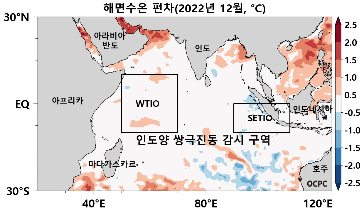2022년 12월 평균 해면수온의 평년 대비 편차 (사각형은 인도양 쌍극진동 감시구역으로 각각 WTIO(열대서인도양), SETIO(열대 남동인도양) 해역이며, 인도양 쌍극진동 지수(DMI: Dipole Mode Index)는 WTIO의 평년 대비 편차에서 SETIO의 평년 대비 편차를 뺀 값입니다.)