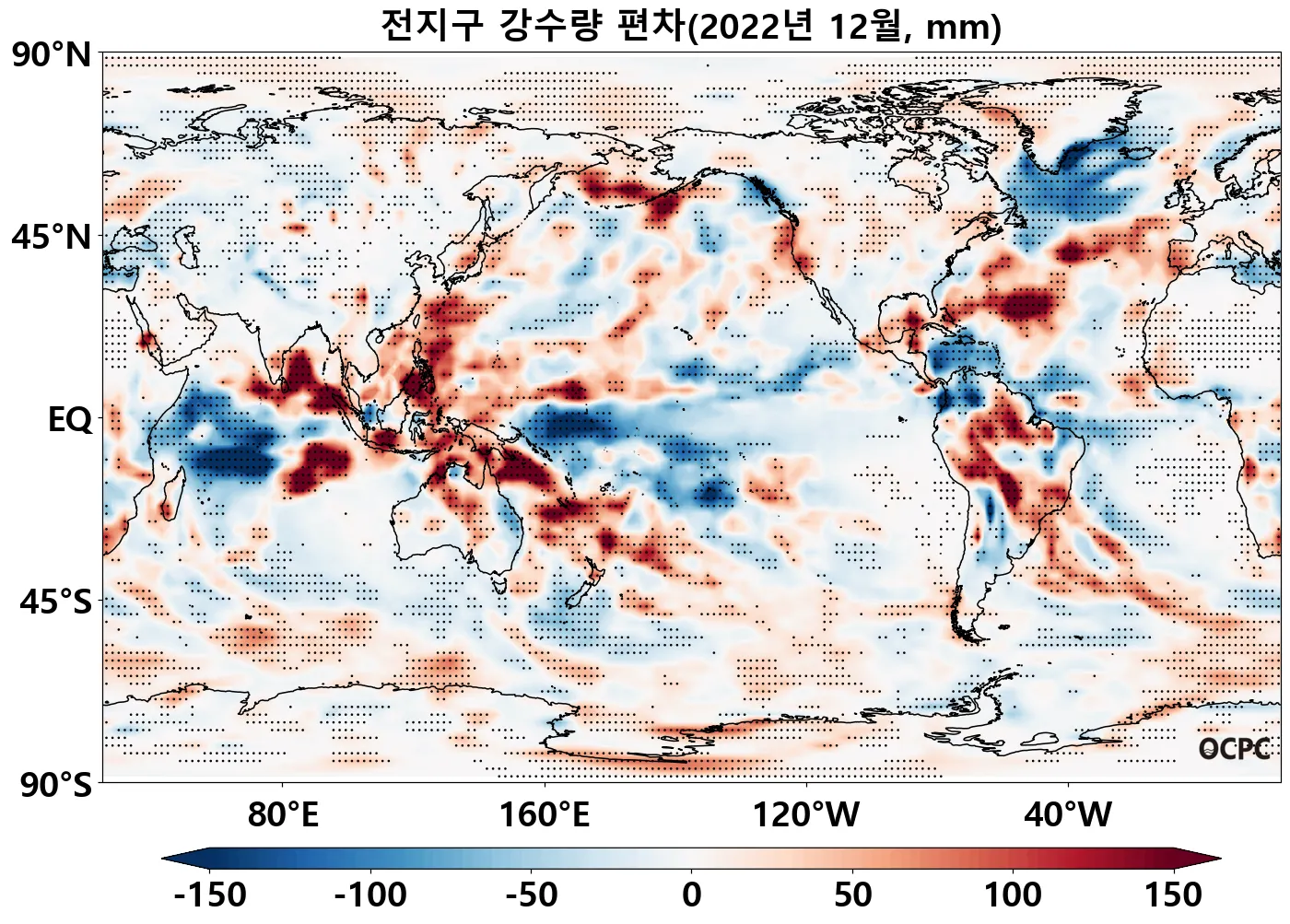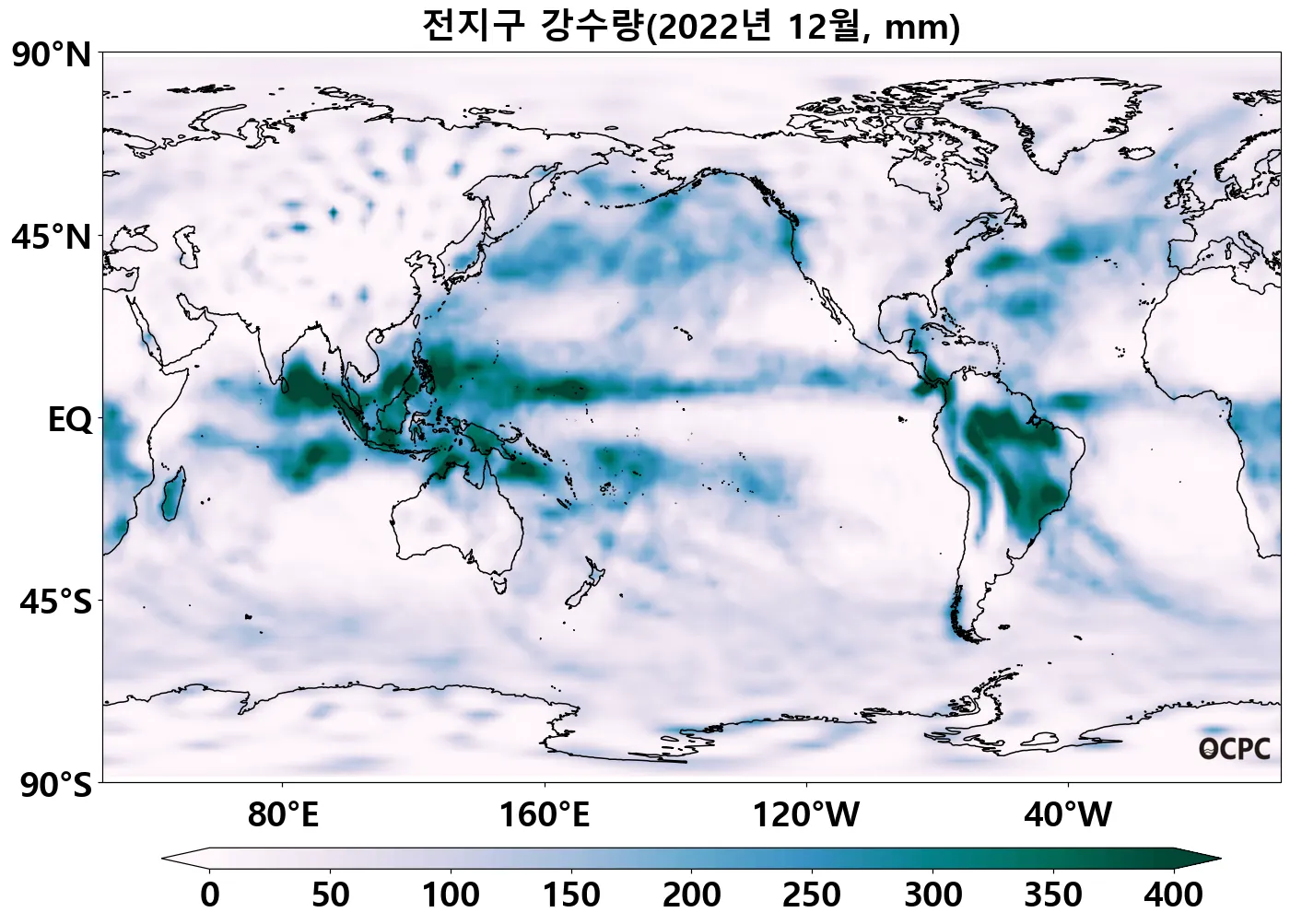 열대 서태평양(155°E~180°, 5°S~0°)과 열대 서인도양(50°E~80°E, 15°S~0°)의 해상강수량은 평년보다 적었습니다.