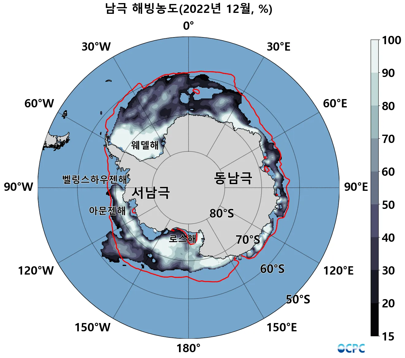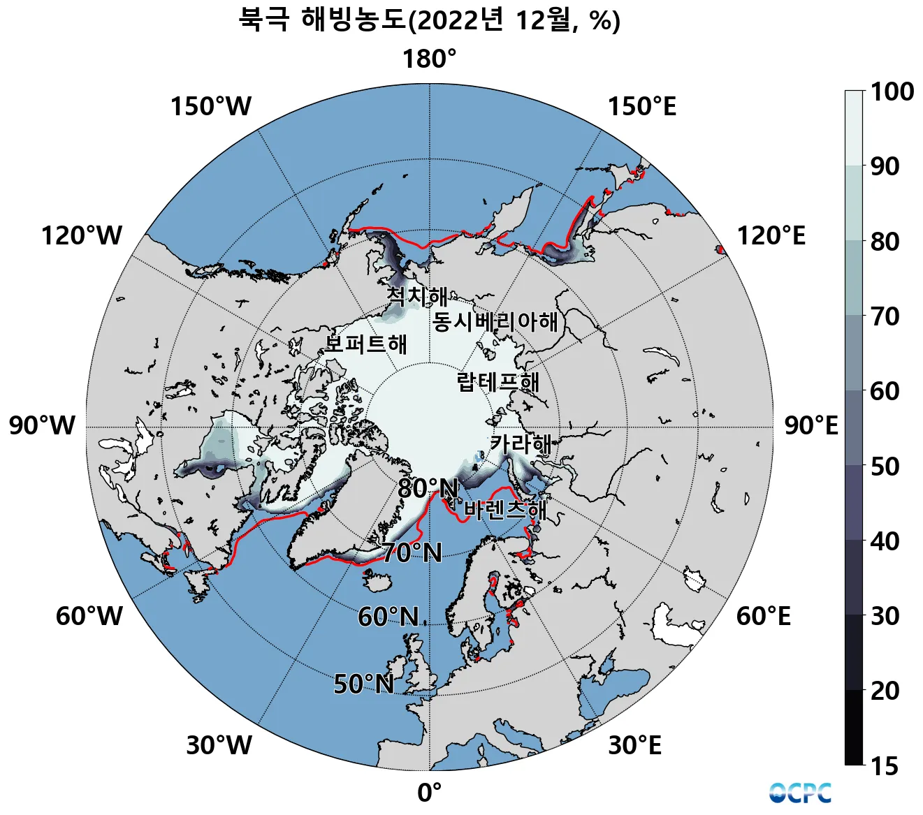 해빙농도 15% 이상 해역, 붉은선(평년 해빙농도 15% 경계)