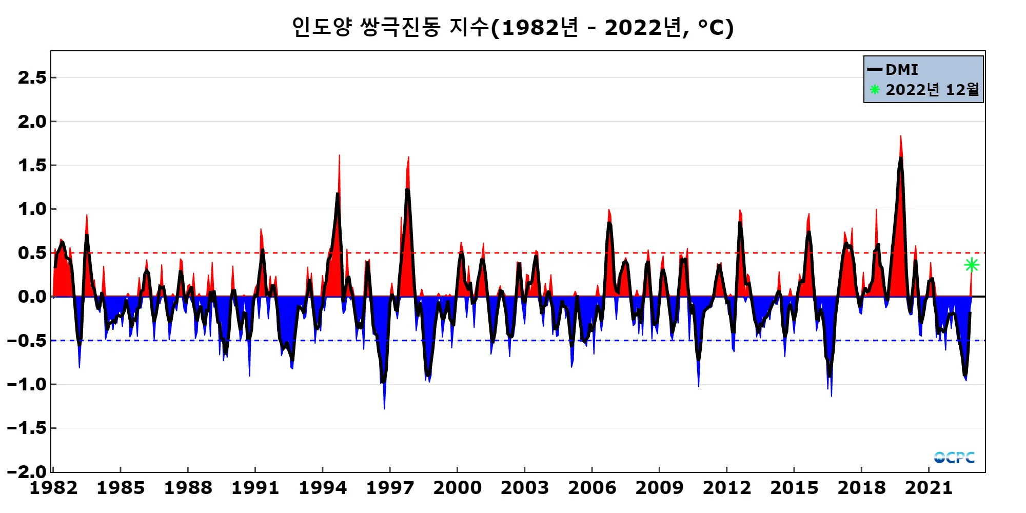 인도양 쌍극진동 지수 DMI (Dipole Mode Index)는 WTIO의 평년 대비 편차에서 SETIO의 평년 대비 편차를 뺀 값으로 월 평균 지수(채색부분)를 3개월 이동평균하여 나타낸 지수(검정선)가 0.5보다 크면 양의 상태로, -0.5보다 작으면 음의 상태로 판정합니다. OCPC 월간 분석정보에서는 당월 평균 지수만을 이용해서 잠정적으로 판정합니다.