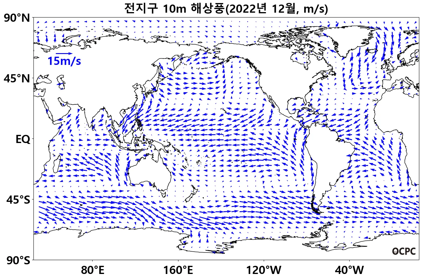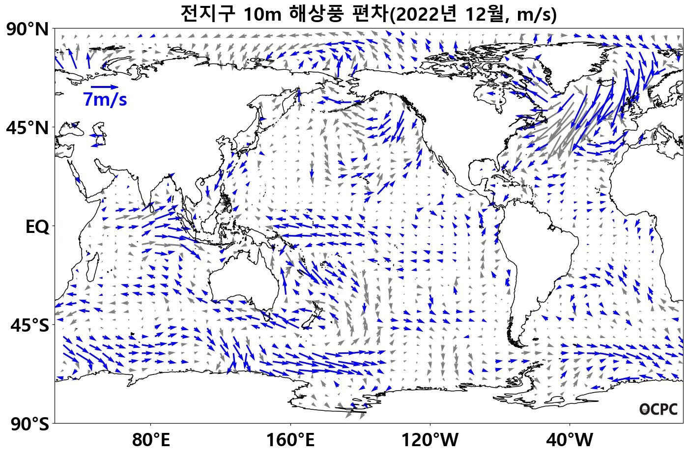열대 태평양(150°E~150°W, 10°S~5°N)의 무역풍(동풍)은 평년보다 강했으며, 북대서양 중위도(30°W~0°, 50°N~70°N) 해역에서는 강한 북풍 편차가 나타났습니다.