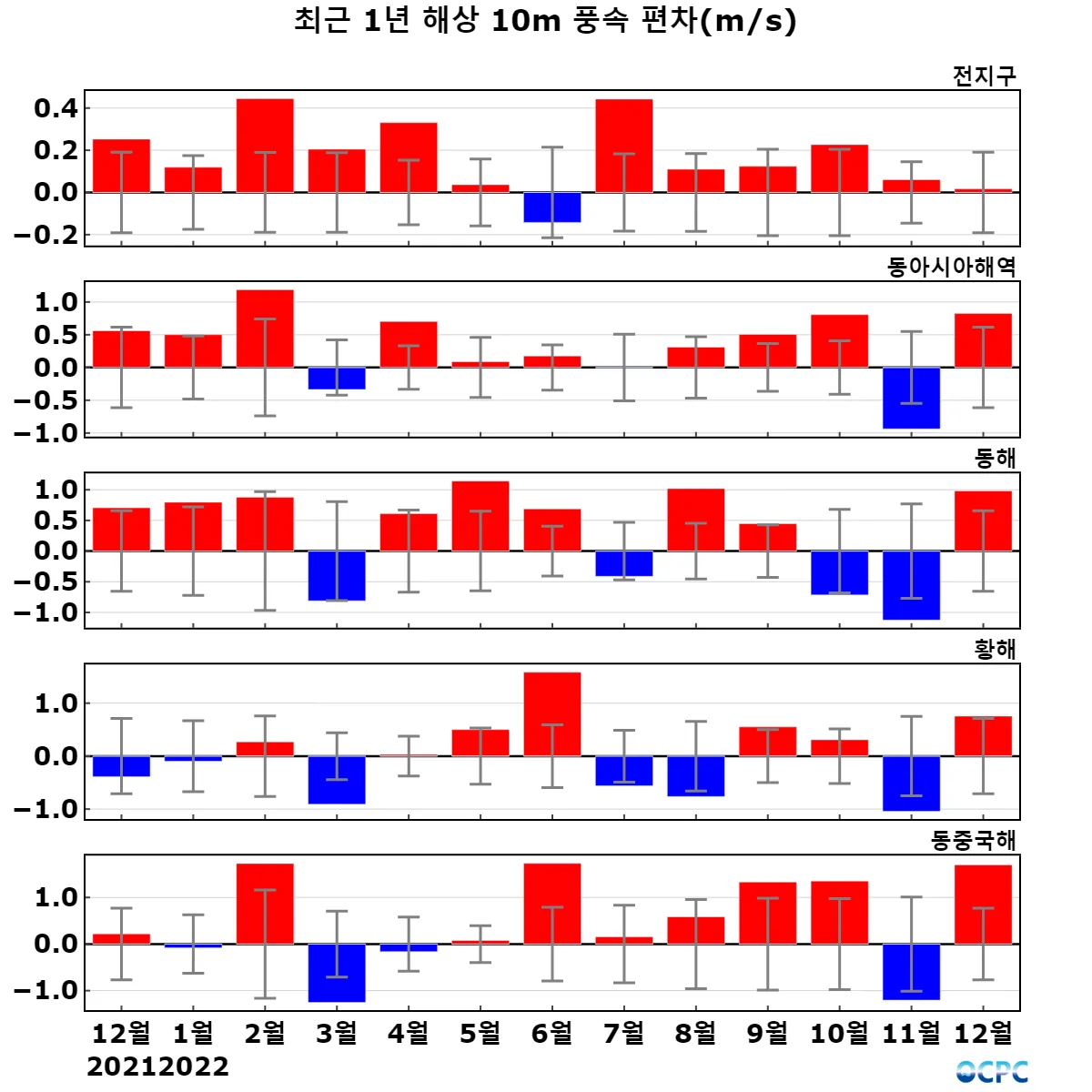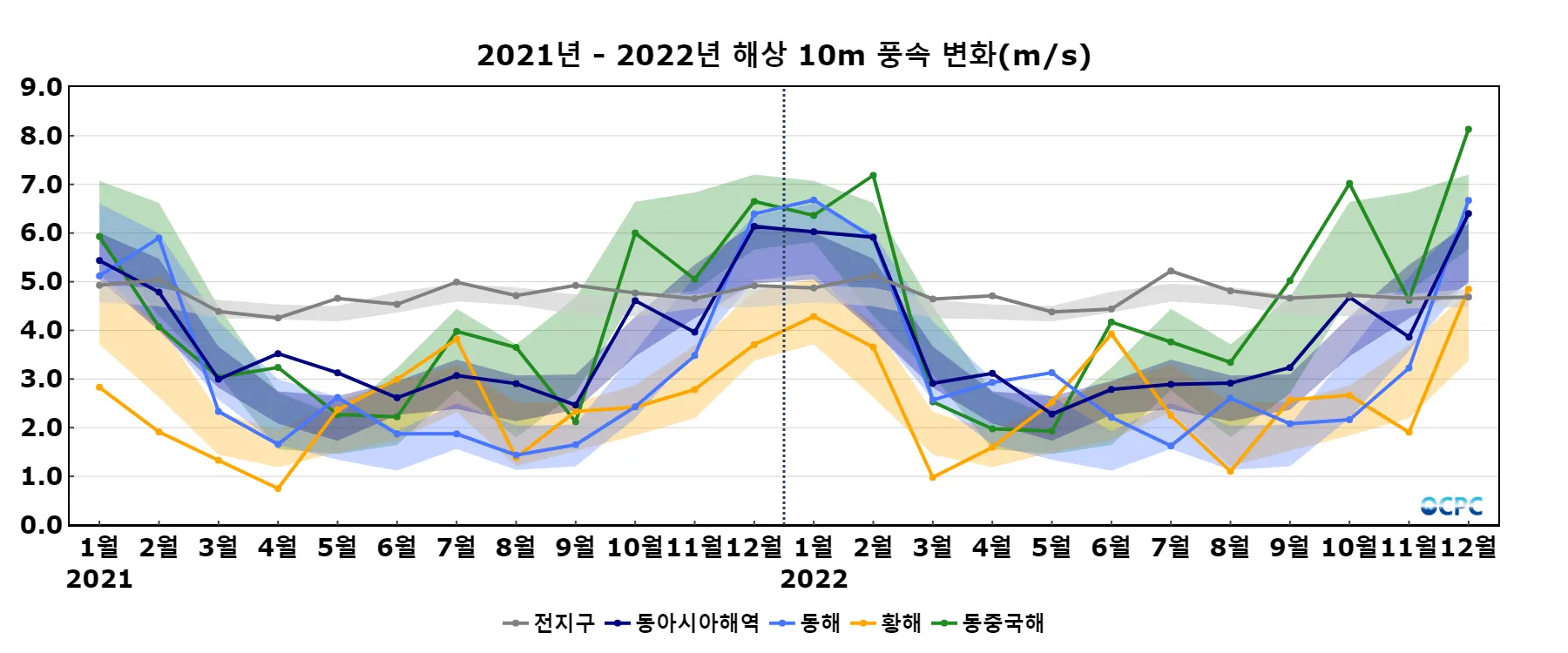 동해, 황해, 동중국해의 해상풍속은 평년(5.7m/s, 4.1m/s, 6.4m/s)보다 1.0m/s(17.2%), 0.8m/s(18.6%), 1.7m/s(26.4%) 강했습니다.