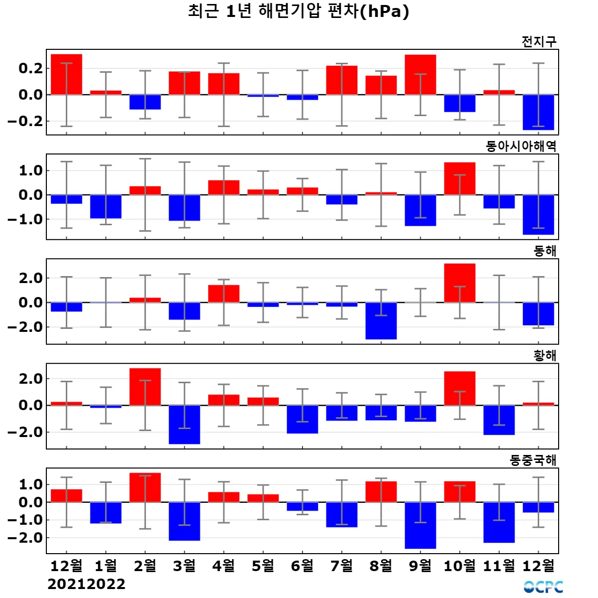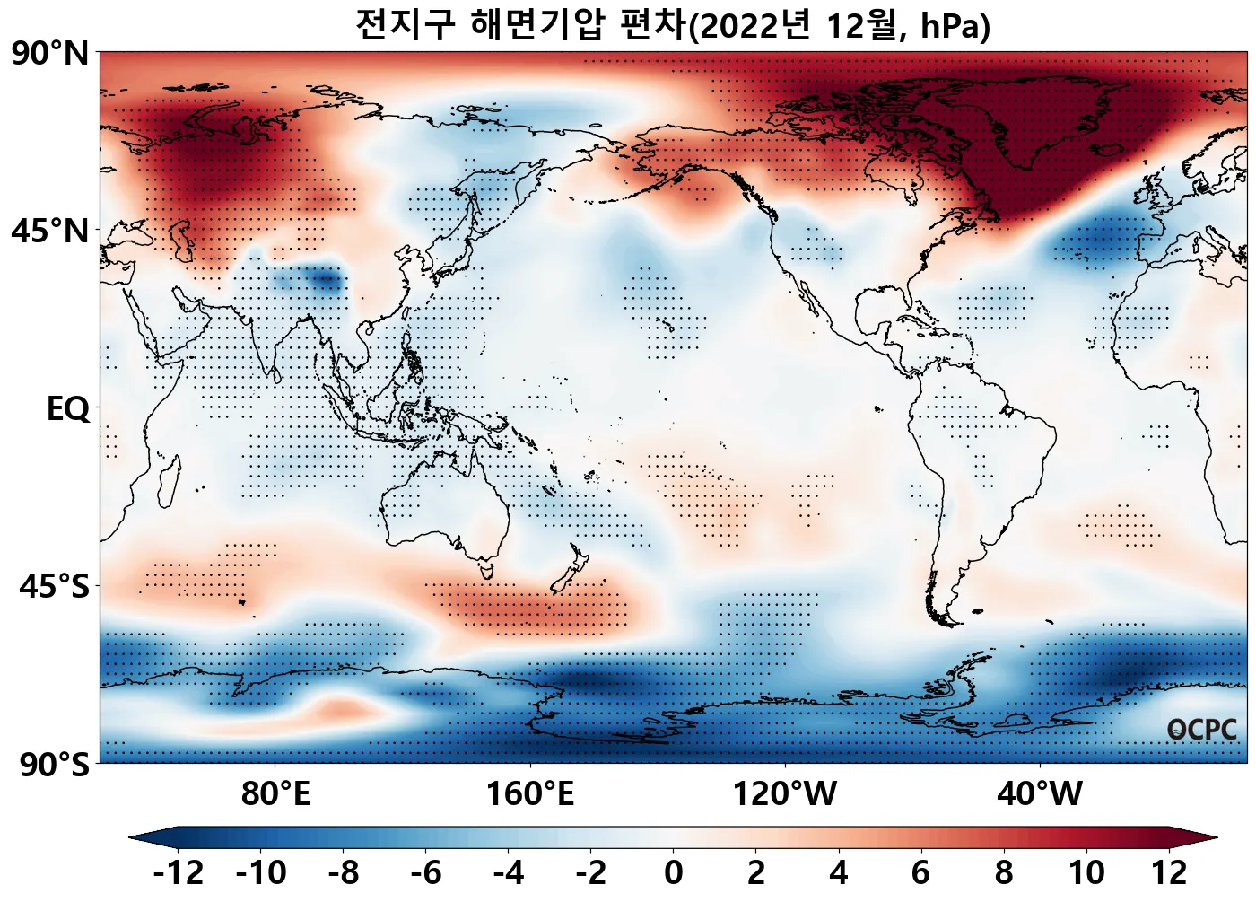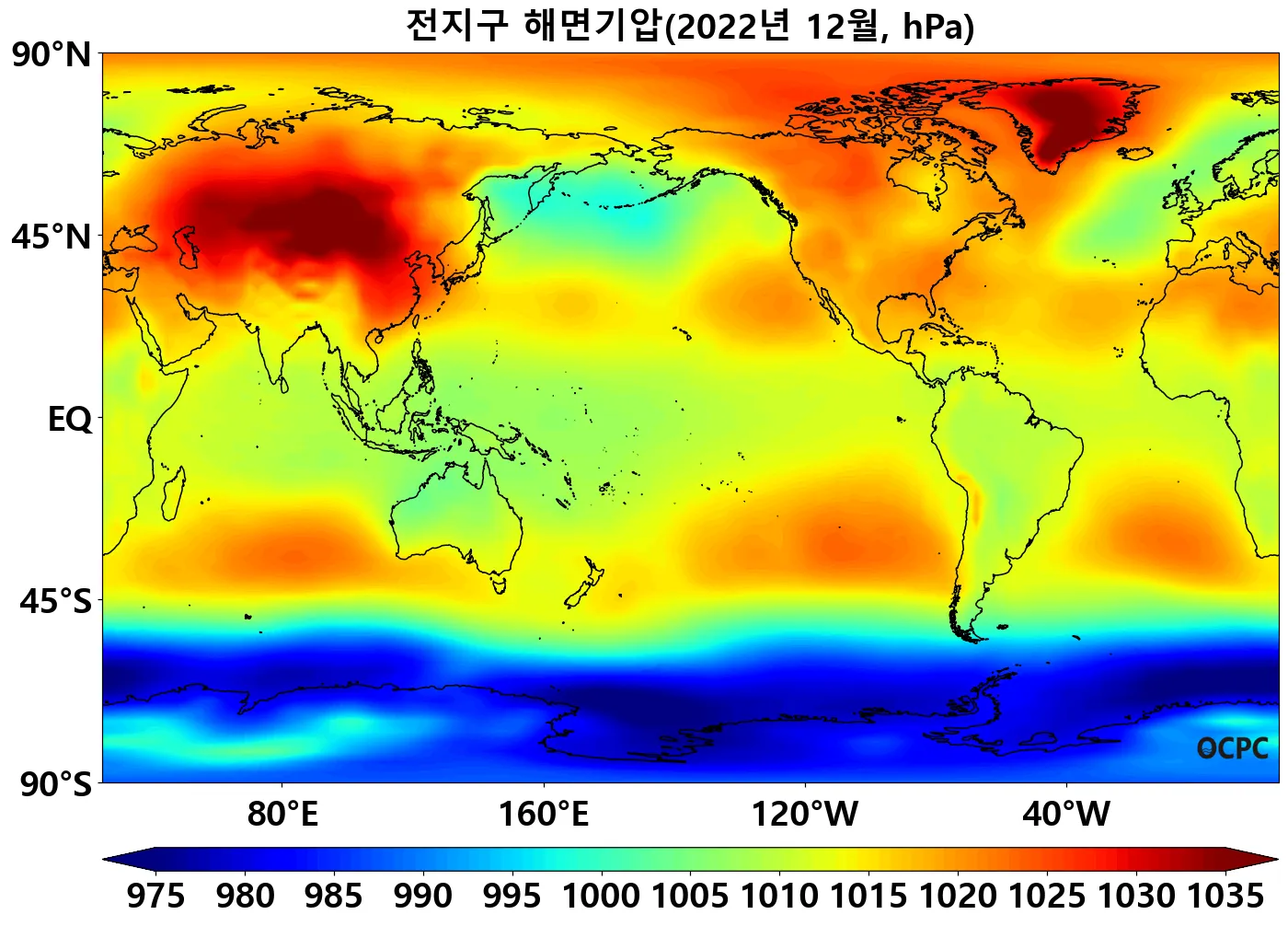 그린란드 주변 해역의 해면기압은 평년보다 두드러지게 높았으며, 남극해는 평년보다 낮았습니다.