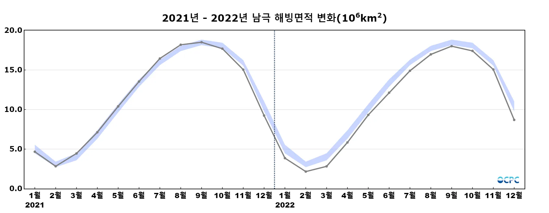 해빙농도 15% 이상 해역, 음영표시: 평년구간(평년평균±표준편차)