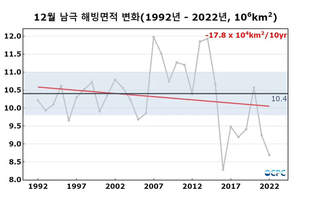 1992~2022년 동안 12월 남극 해빙면적은 10년에 17.8만km²씩 감소하는 추세입니다.