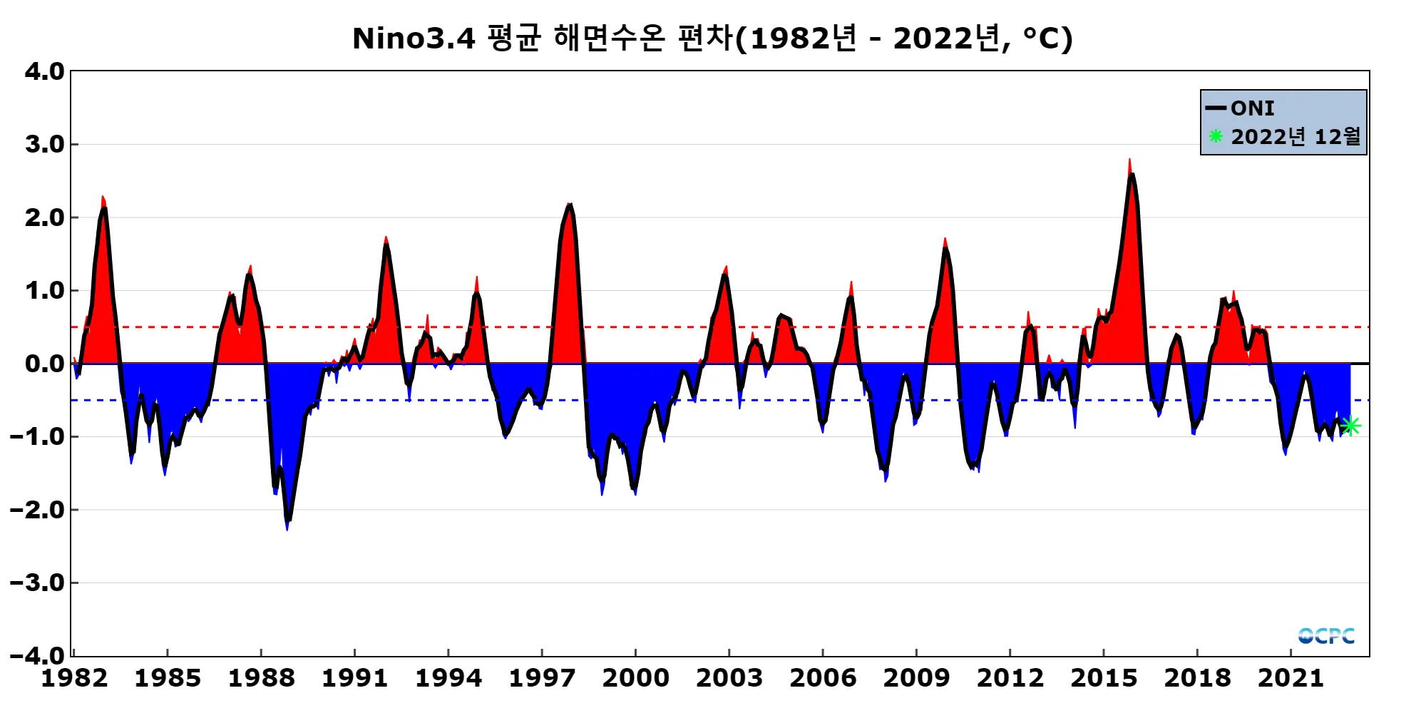 ONI (Ocean Nino Index): 엘니뇨/라니냐 감시구역인 Nino3.4 해역의 월평균 해면수온 편차(채색부분)를 3개월 이동평균하여 나타낸 지수(검정선)로 0.5보다 크면 엘니뇨, -0.5보다 작으면 라니냐로 판정합니다. OCPC 월간 분석정보에서는 당월 평균 지수를 기준으로 잠정적으로 엘니뇨 또는 라니냐로 판정합니다.