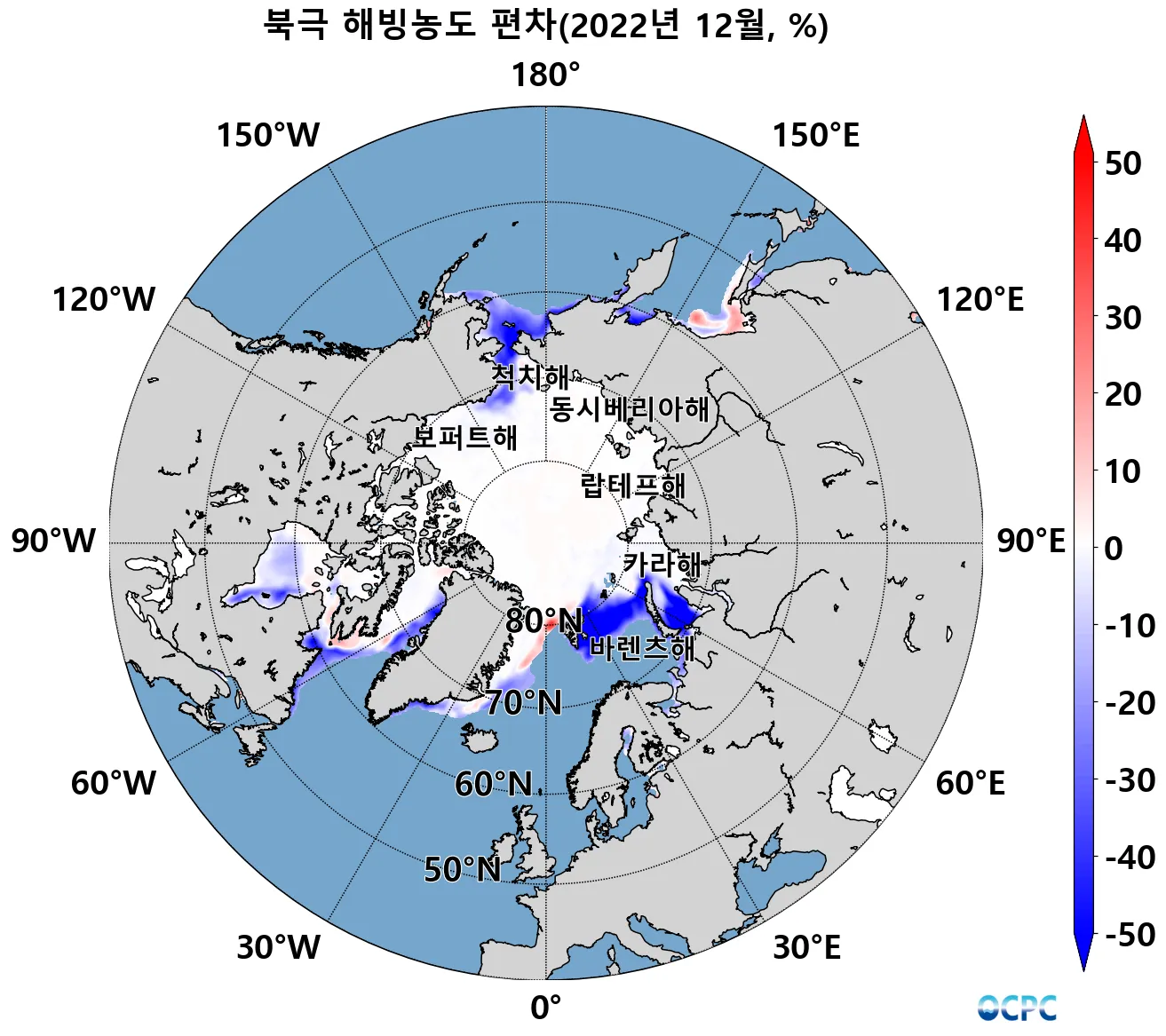 해빙농도 편차(당월·평년 해빙농도 15% 미만 해역 제외)
