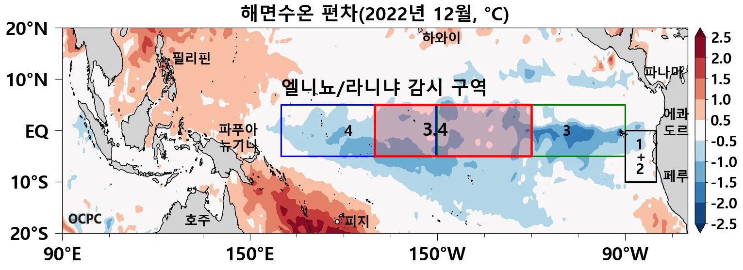 엘니뇨/라니냐 감시구역인 열대태평양 Nino3.4 해역(5°S~5°N, 170°W~120°W)의 12월 평균 해면수온 편차(-0.9°C)는 라니냐에 해당합니다.