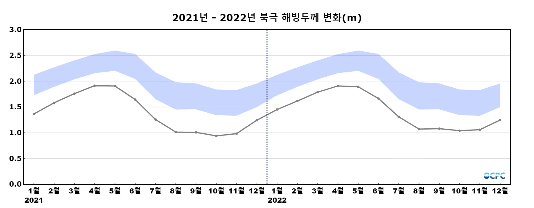 북극 해빙두께 시계열 자료의 영역평균 기준이 해빙농도(15% 이상)에서 해빙두께(0.15m 초과)로 변경되었습니다. (2023.01.16)