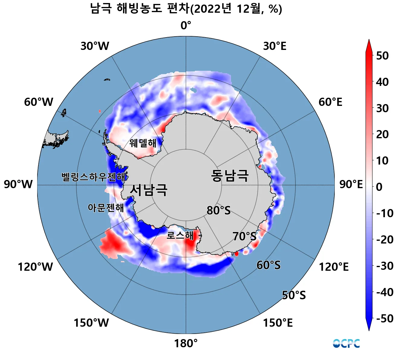 로스해, 웨델해를 제외한 대부분의 해역에서 평년보다 해빙면적이 감소했습니다.