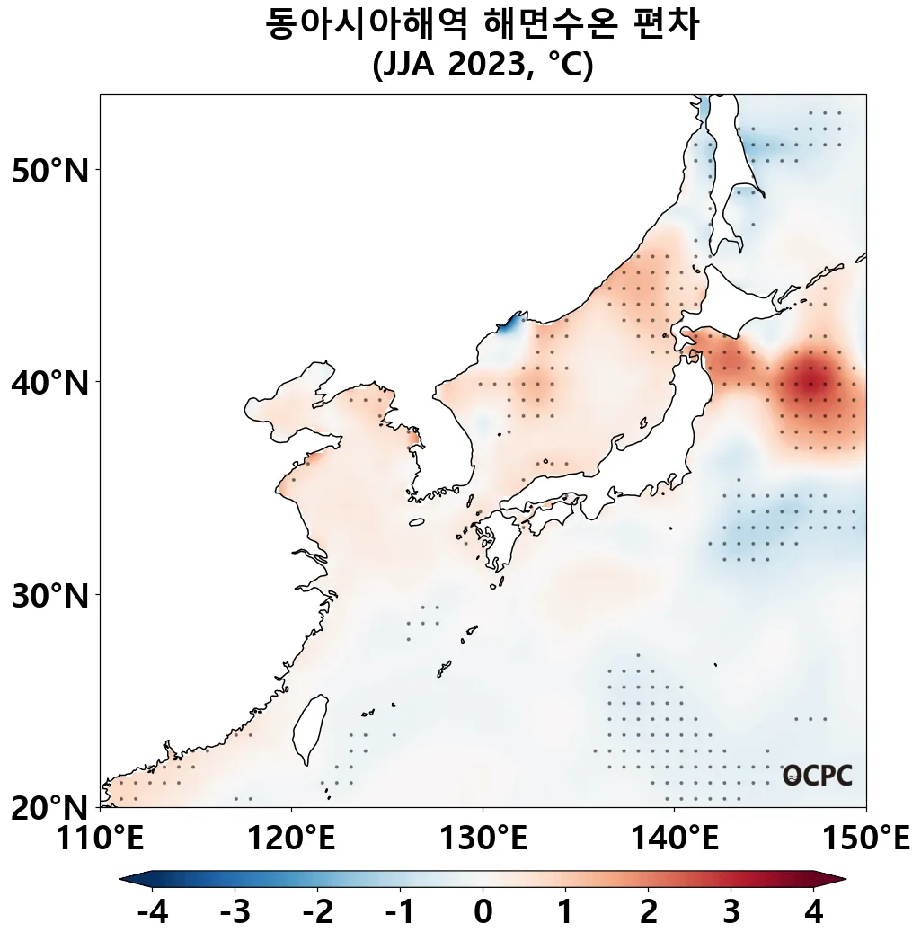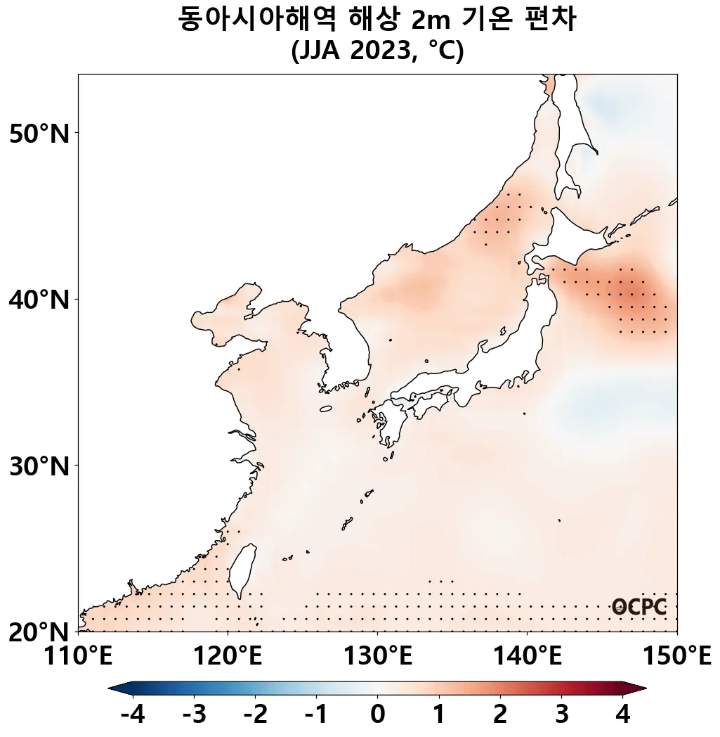 A-B. 동아시아해역 해상기온 편차 전망(2023년 6~8월 평균, 점표시: 평년 표준편차 초과 해역)