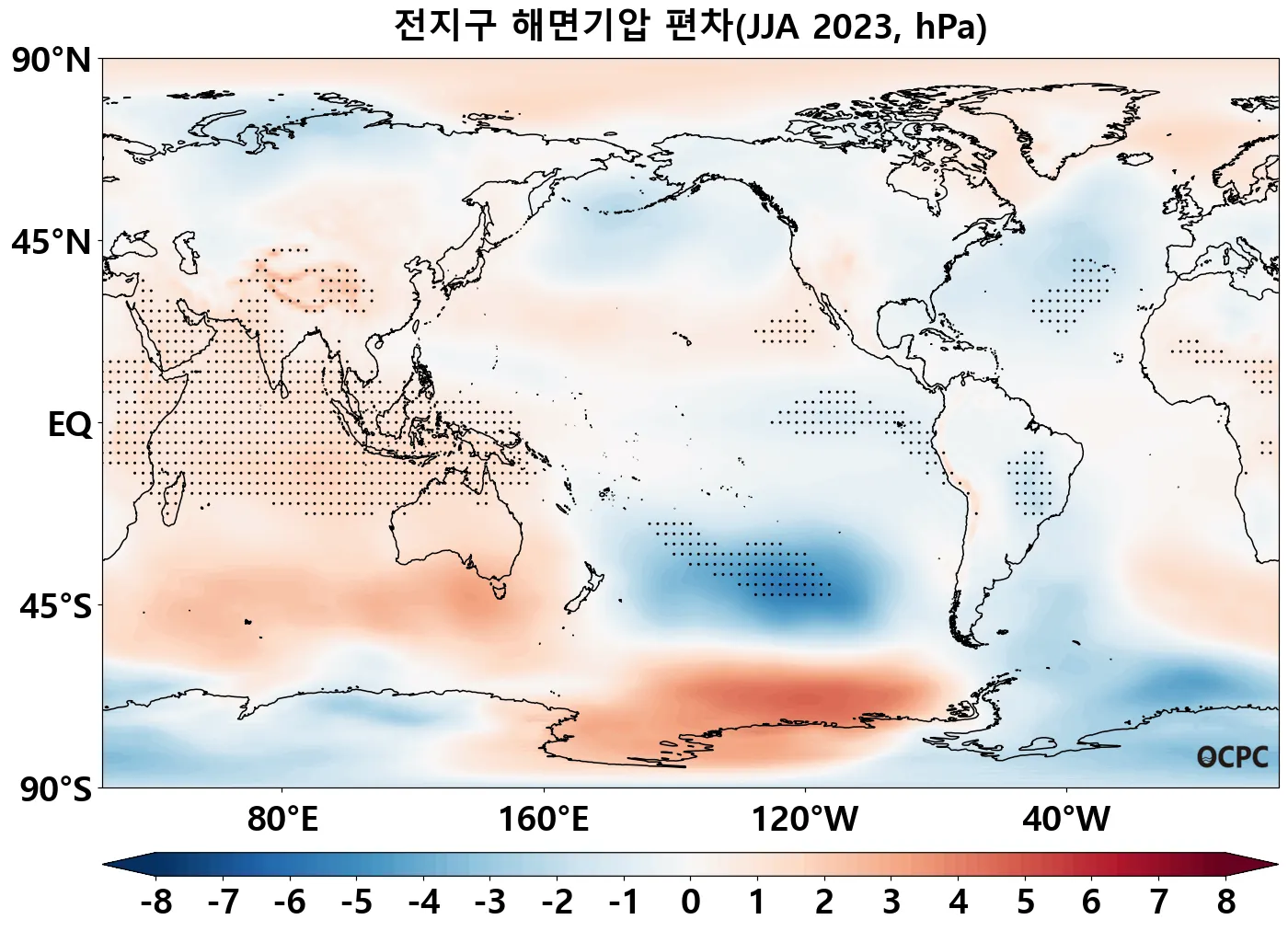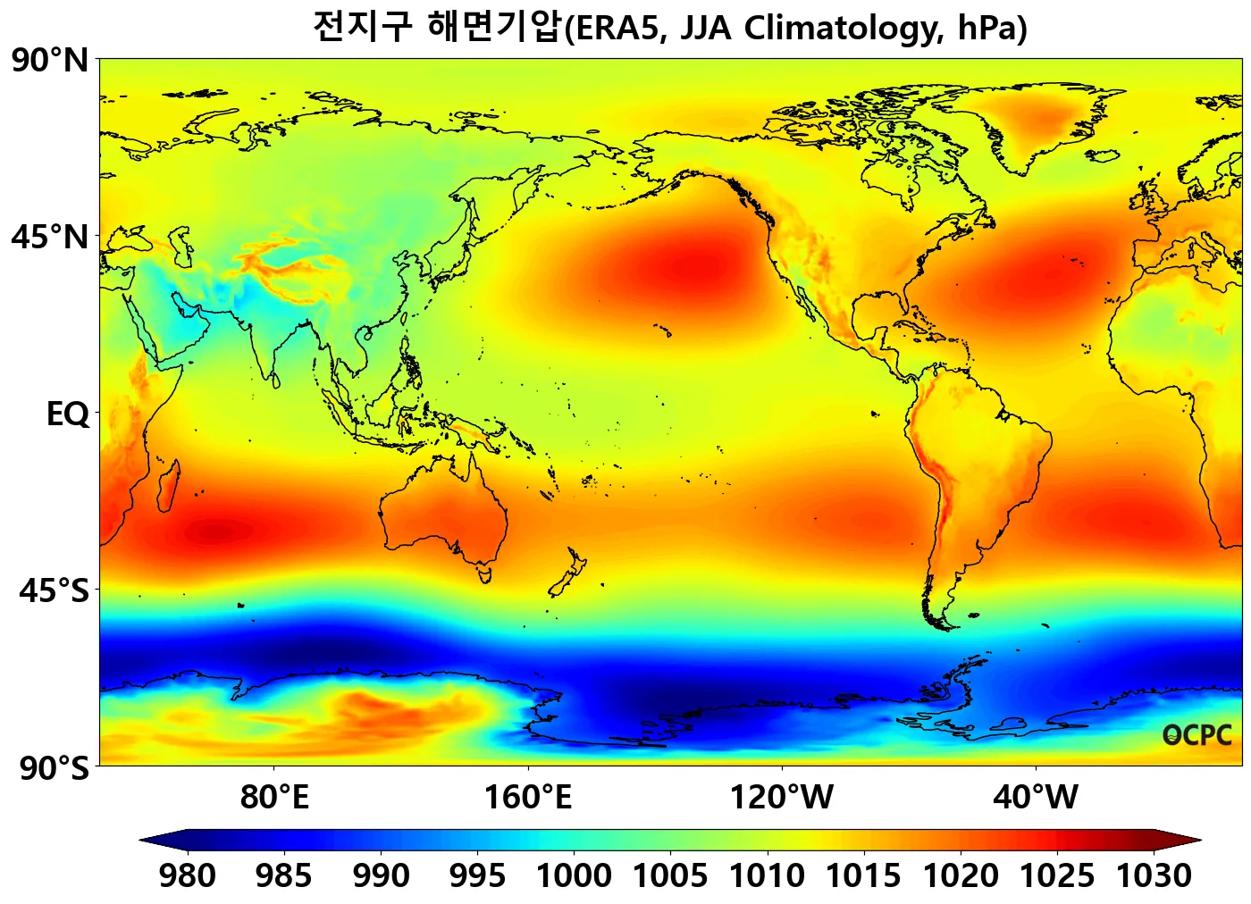 전지구 6~8월 평균 해면기압은 평년(1011.6±0.2hPa)과 비슷하겠습니다.
