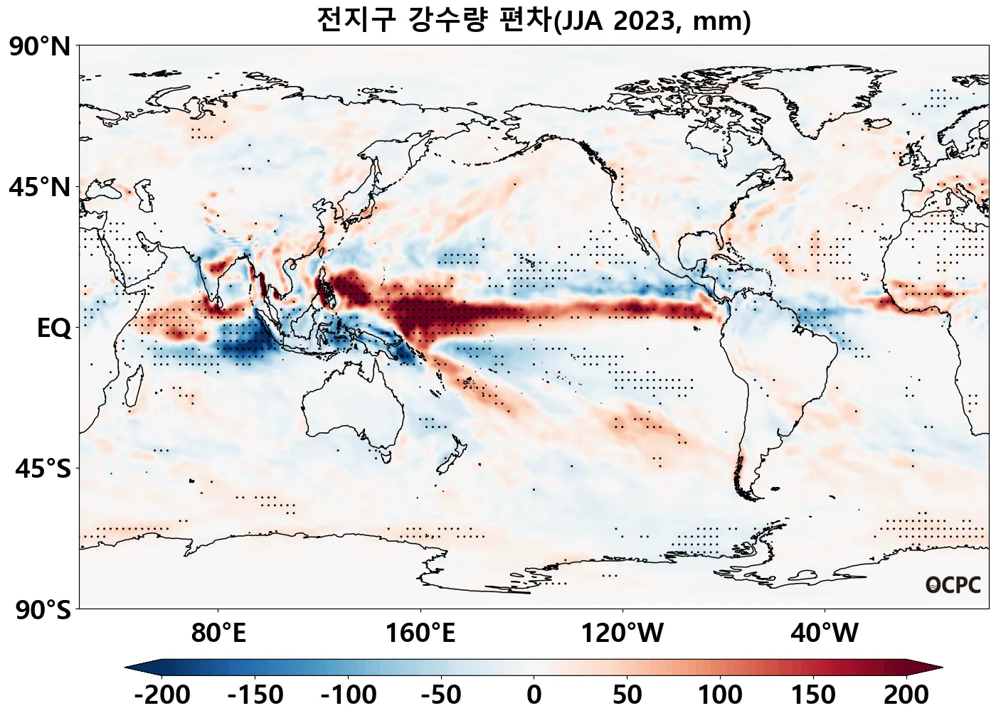 A-B. 전지구 강수량 편차 전망(2023년 6~8월 평균, 점표시: 평년 표준편차 초과 해역)