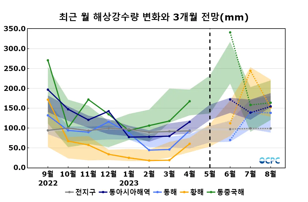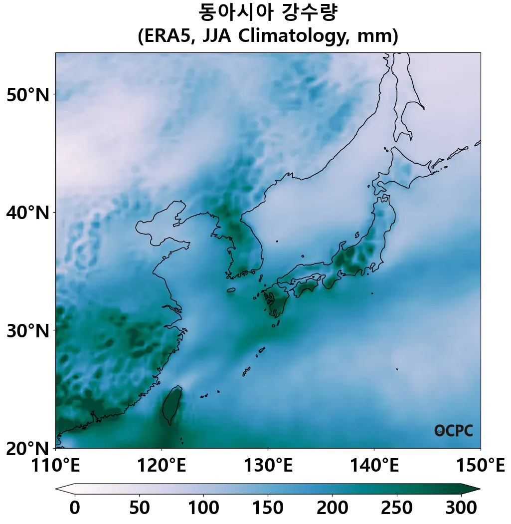 동아시아해역의 6~8월 평균 해상강수량은 평년(157.9±20.8mm)과 비슷하겠습니다.