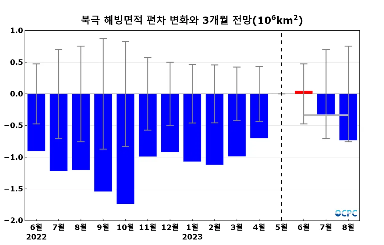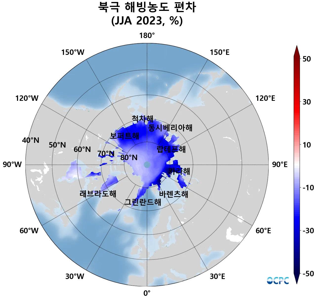 A-B. 북극 해빙농도 편차 전망(2023년 6~8월 평균, 15% 이상 해역)
