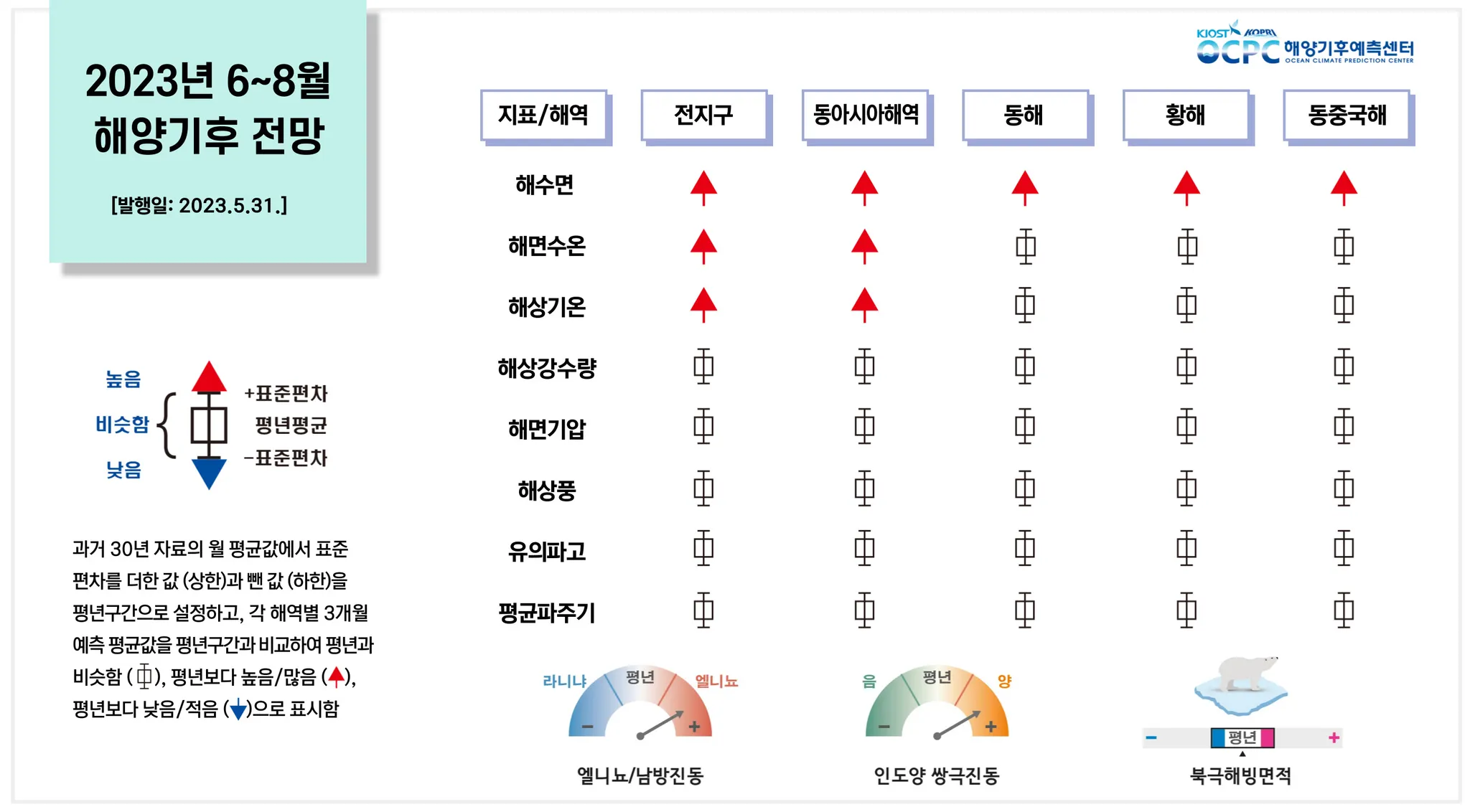 전지구 6~8월 평균 해상기온은 평년(16.6±0.1℃)보다 높겠으며, 북극해와 남극해 중심으로 평년보다 높은 기온이 전망됩니다.