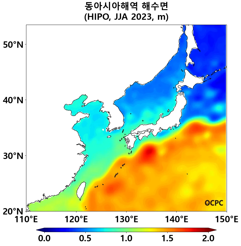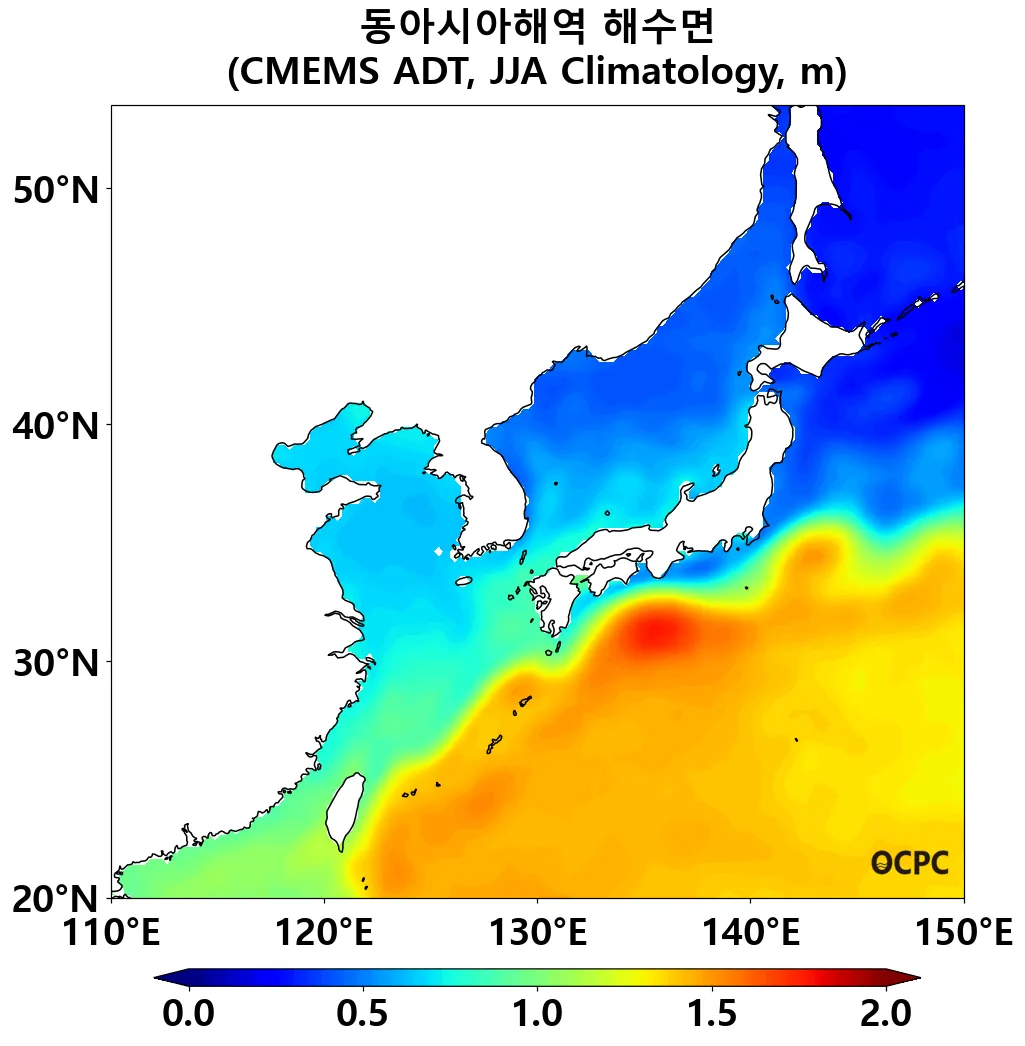 동아시아해역의 6~8월 평균 해수면은 평년(1.00±0.08m)보다 높겠습니다.