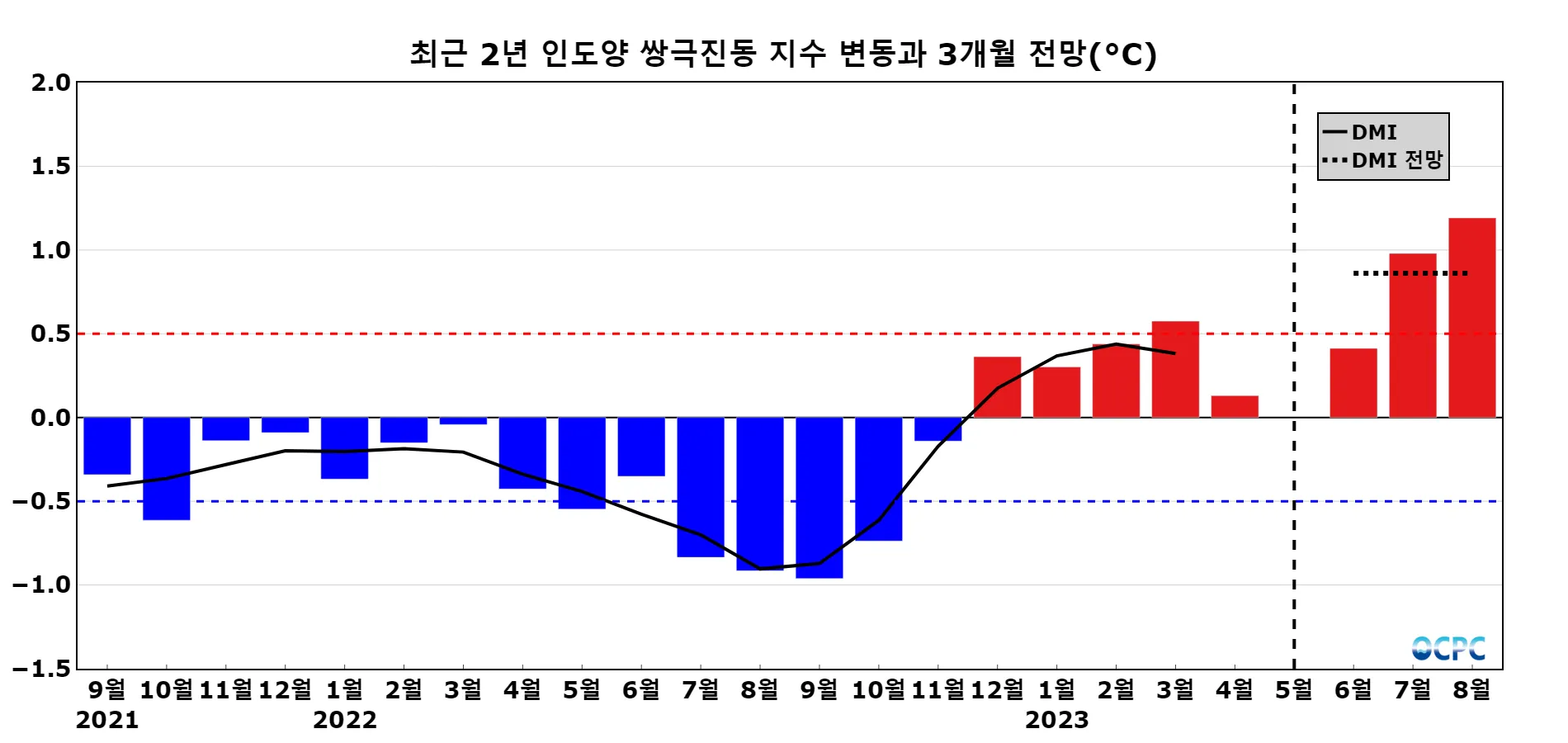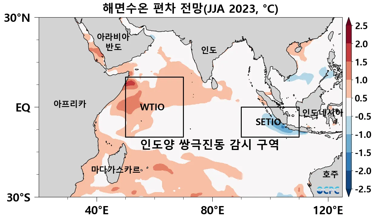2023년 6~8월(JJA) 평균 열대 서인도양 해역(WTIO)과 남동인도양 해역(SETIO)의 해면수온 편차 차이가 0.5°C 이상으로 인도양 쌍극진동 지수는 양의 상태일 것으로 전망됩니다.