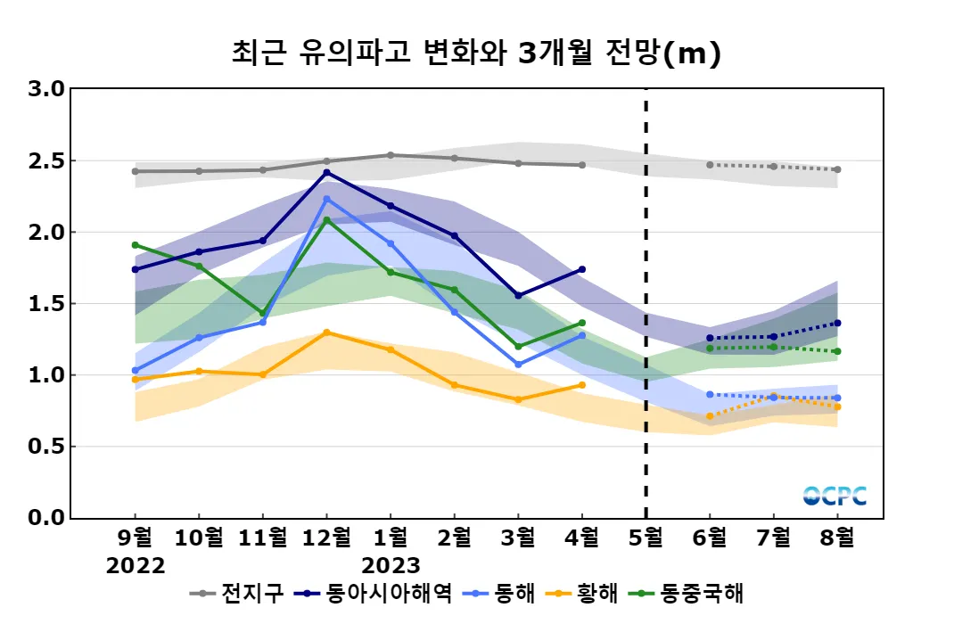 동해, 황해, 동중국해의 평균 유의파고는 평년(0.8±0.1m, 0.7±0.1m, 1.2±0.1m)과 비슷할 것으로 전망됩니다.