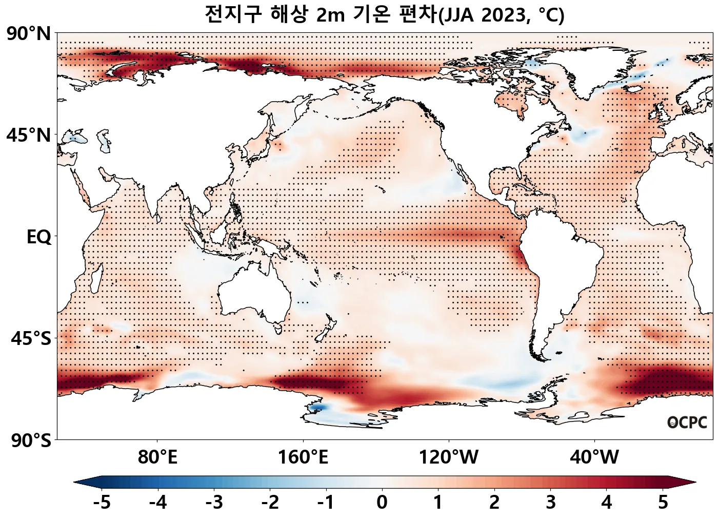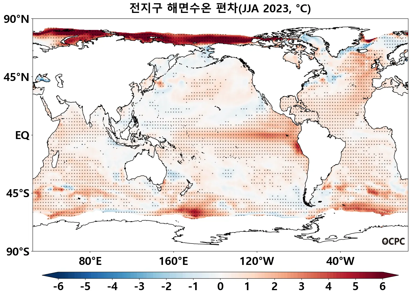 A-B. 전지구 해상기온 편차 전망(2023년 6~8월 평균, 점표시: 평년 표준편차 초과 해역)