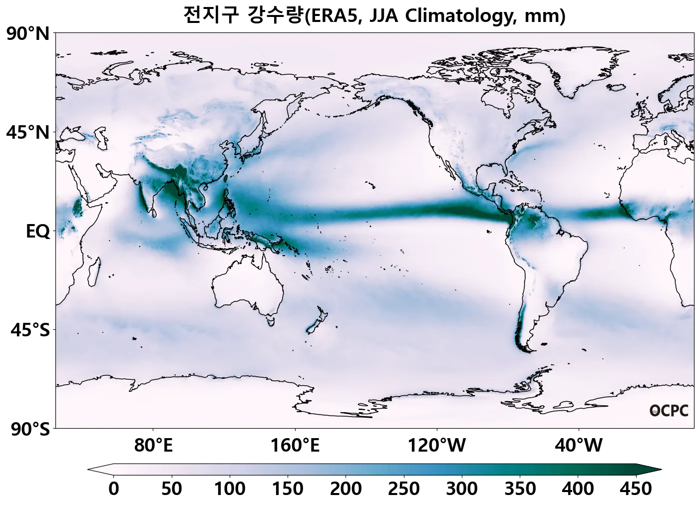 전지구 6~8월 평균 해상강수량은 평년(96.6±2.7mm)과 비슷하겠습니다.