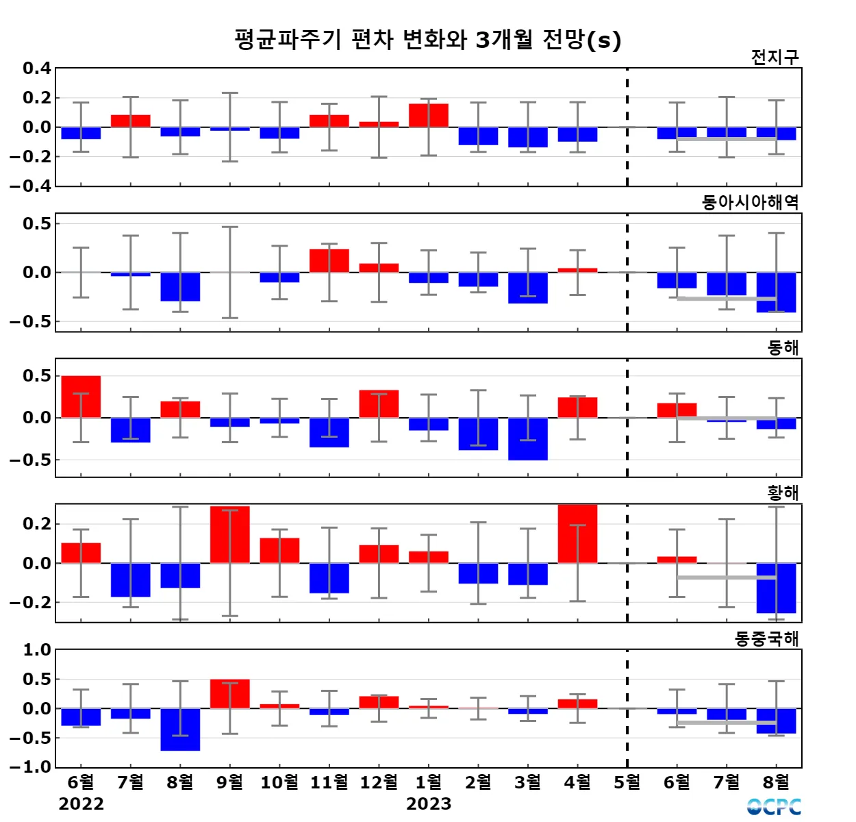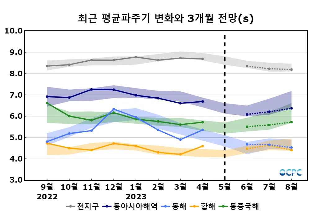 동해, 황해, 동중국해의 평균파주기는 평년(4.6±0.3초, 4.6±0.2초, 5.9±0.4초)과 비슷할 것으로 전망됩니다.